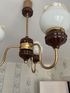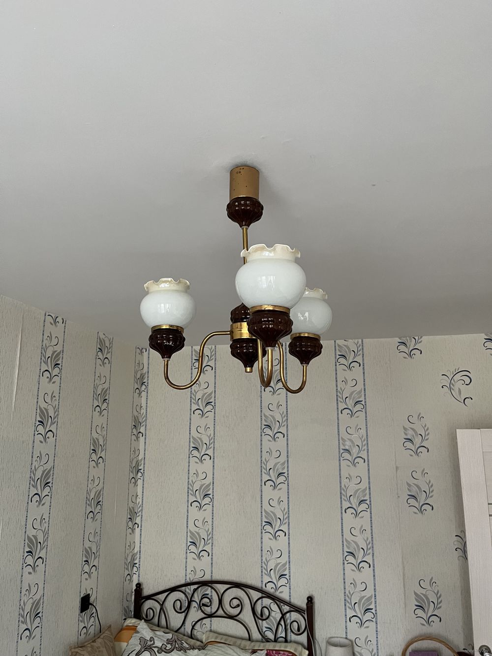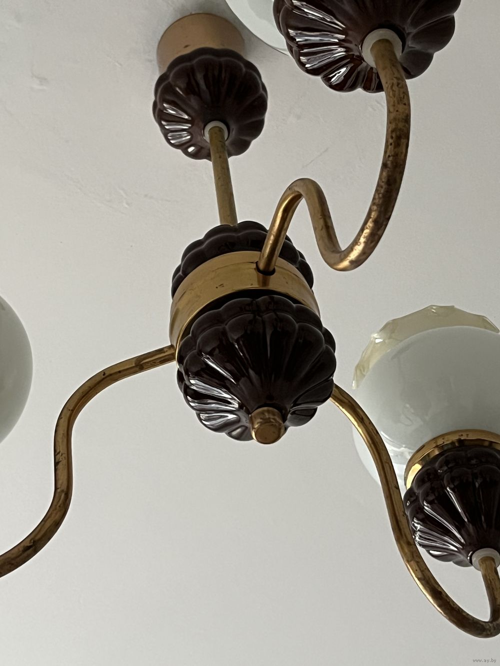 Люстра металл, керамика, клеймо Ленинградское ПО «Луч», встречается редко, даже в России. Есть следы естественного старения. Есть пару реставрированных сколов. Плафоны белые небольшие, без дефектов.