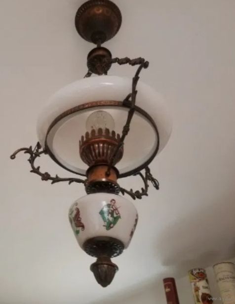 Люстра в виде керасиновой лампы, плафон зеленоватый