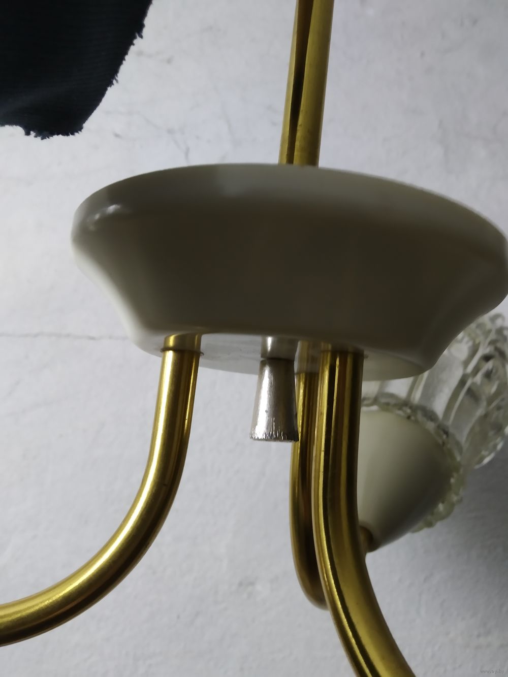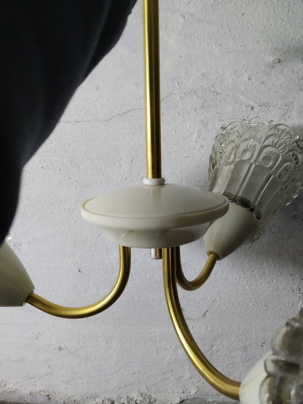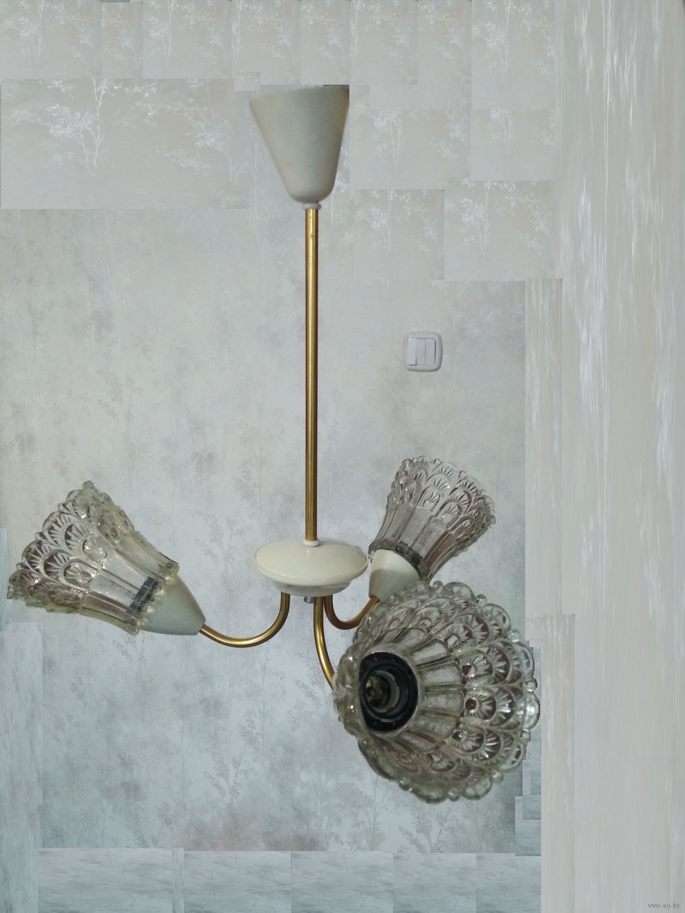 Люстра из СССР классическая советская. Примерно 60-70-е годы. Из желтого металла, латунь. В карболитовых патронах – клеммы из латуни, а не как сейчас из консервной банки.