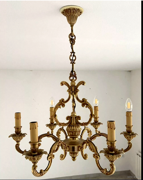 Люстра старинная. Стиль Людовик XV. Франция. Бронза. Дизайн в стиле Людовика XV. Диаметр 60 см, полная высота с цепью 80 см (50 см без цепи) на 5 лампочек, цоколь Е14 (узкий). Весит люстра 8 кг. Люстра в идеальном состоянии. Видео отправлю по запросу. Телефон указан в контактных данных продавца.