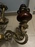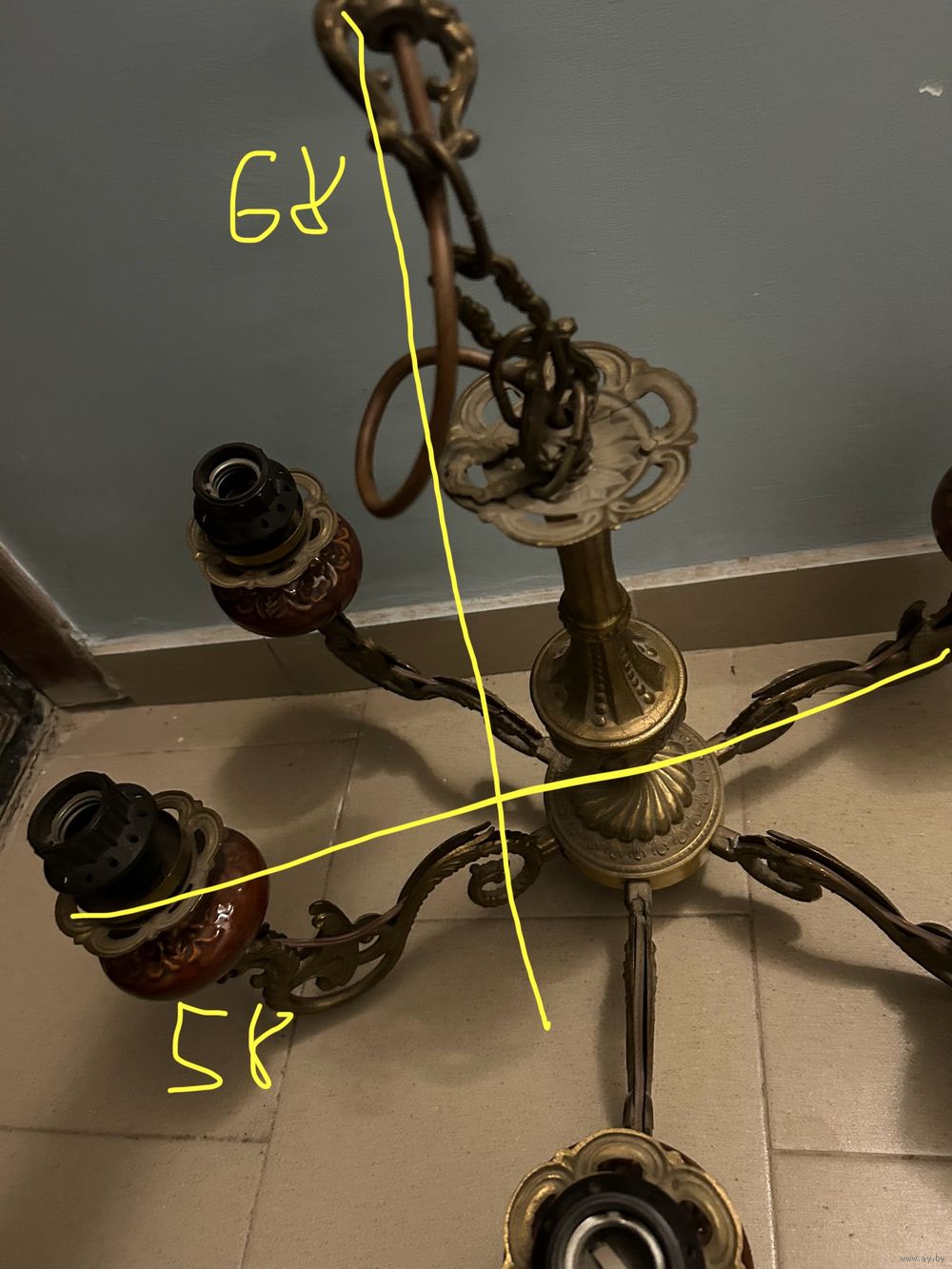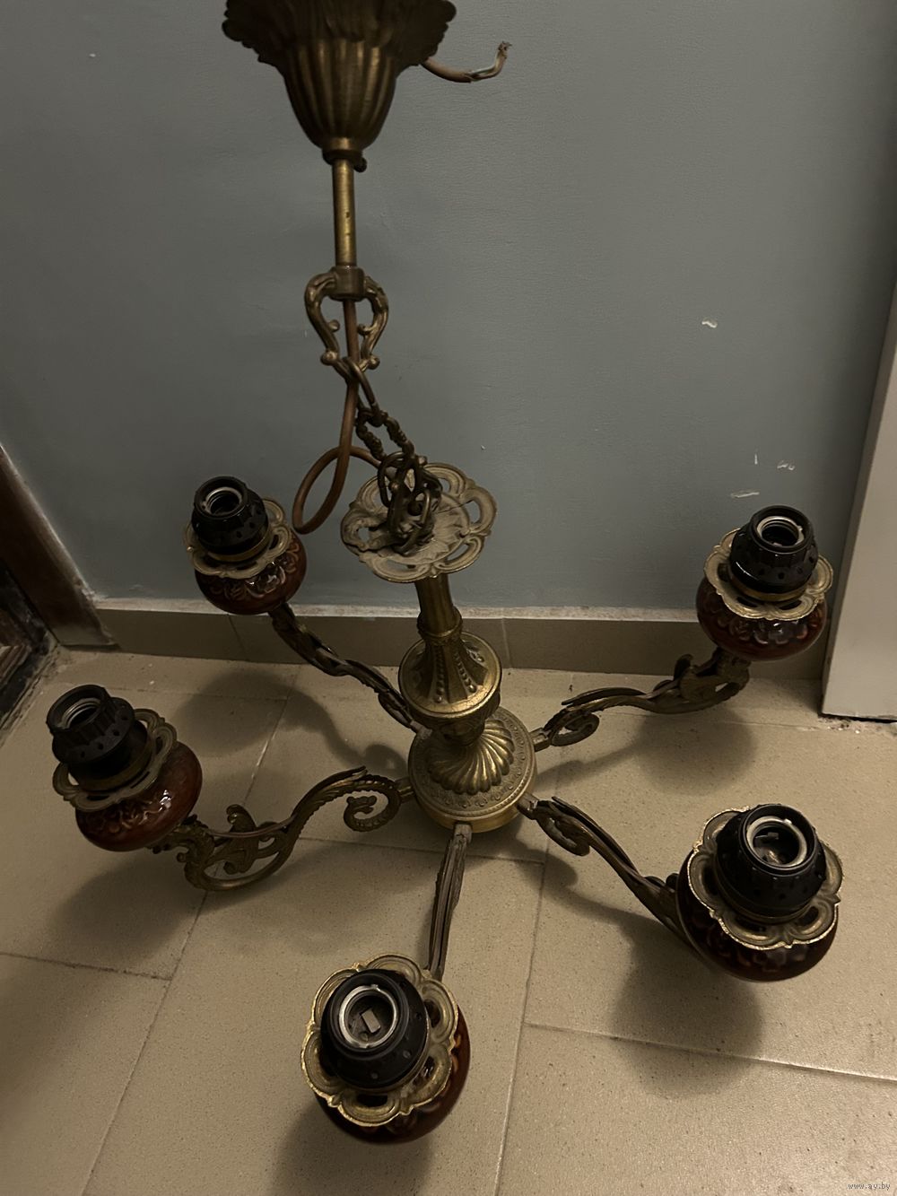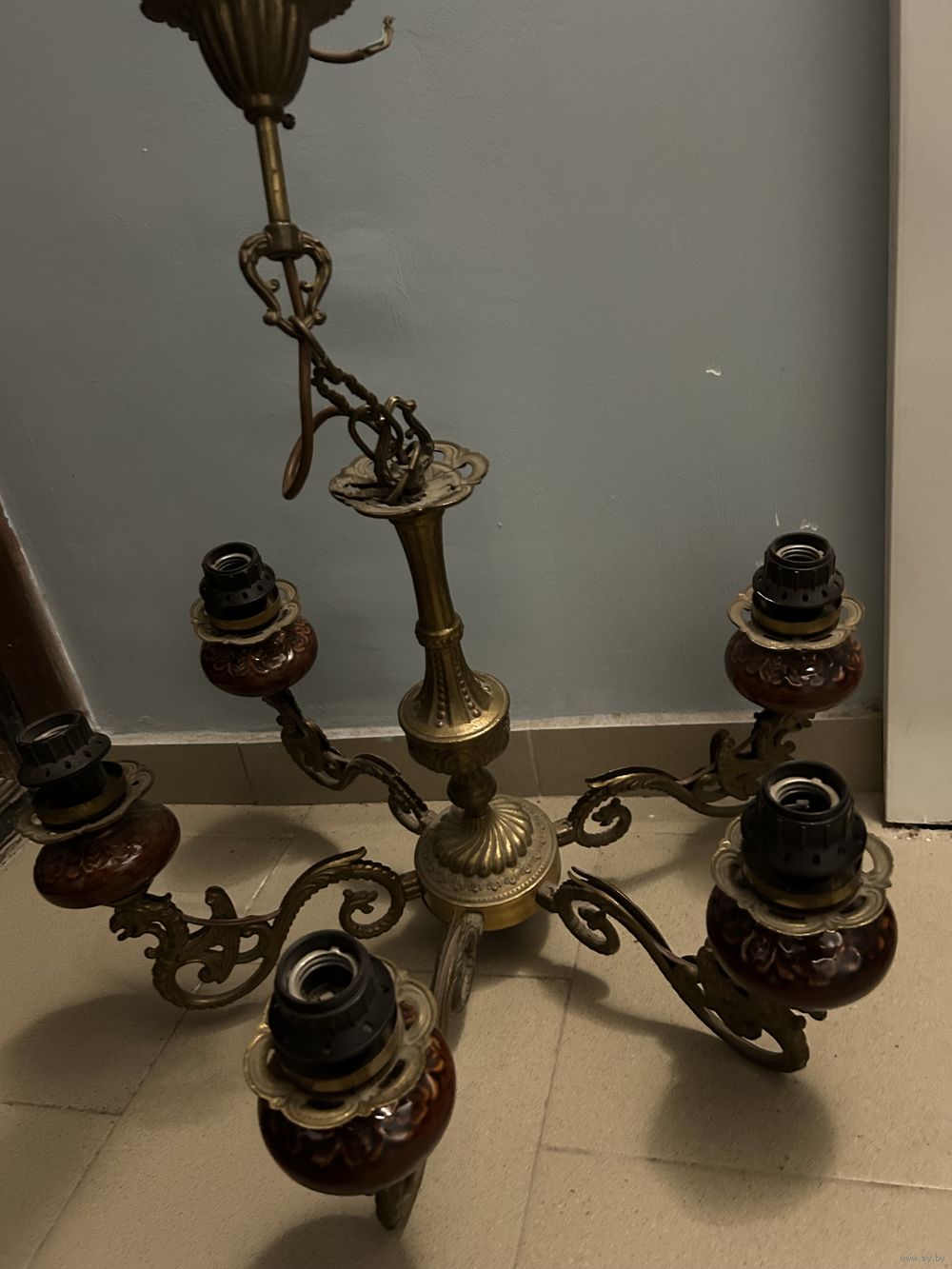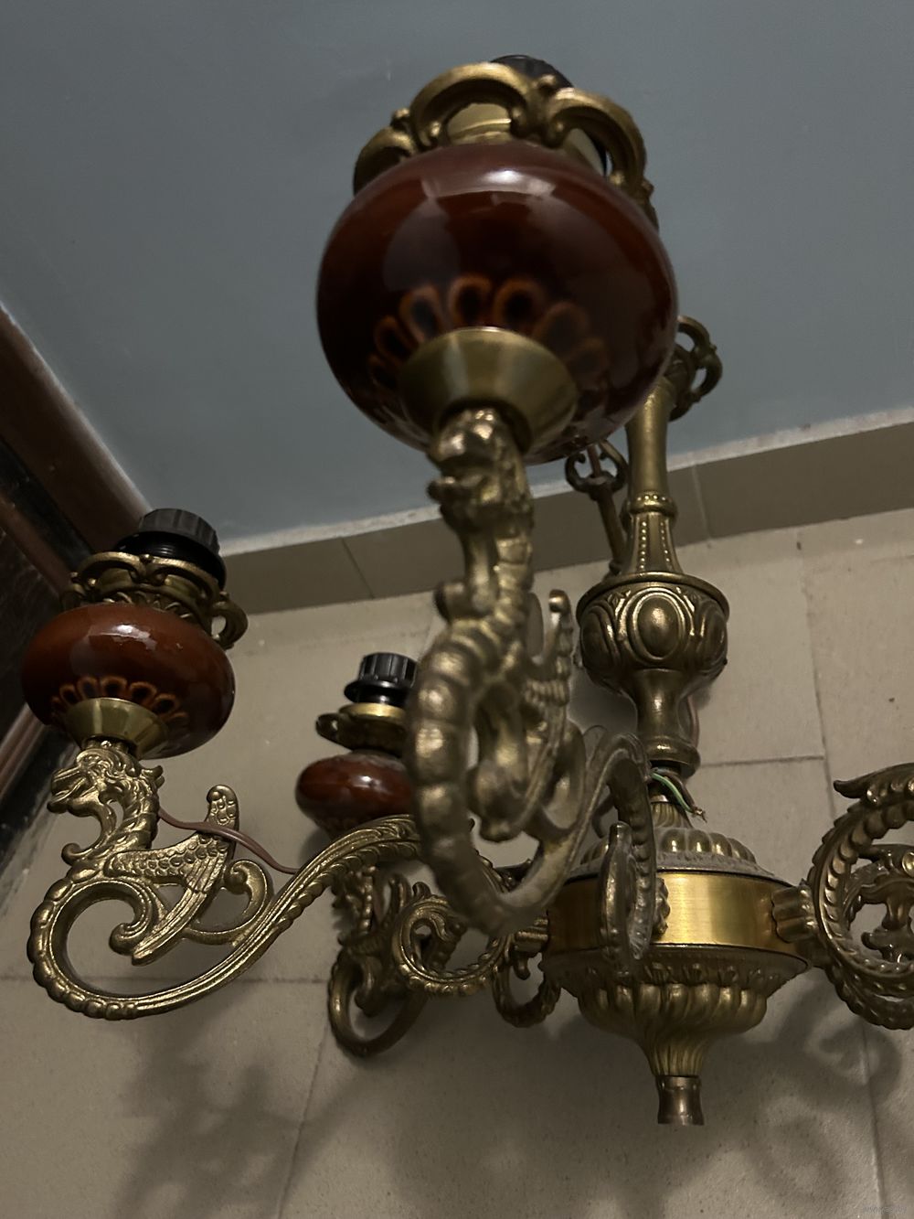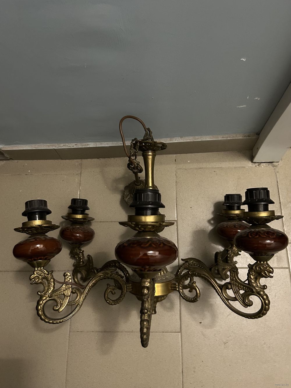 Люстра латунь бронза фаянс шикарная винтаж Югославия. Продается как на фото без плафонов . Люстра изначально на 6 рожков , одного не хватает . Поэтому в переделку на пятирожковую