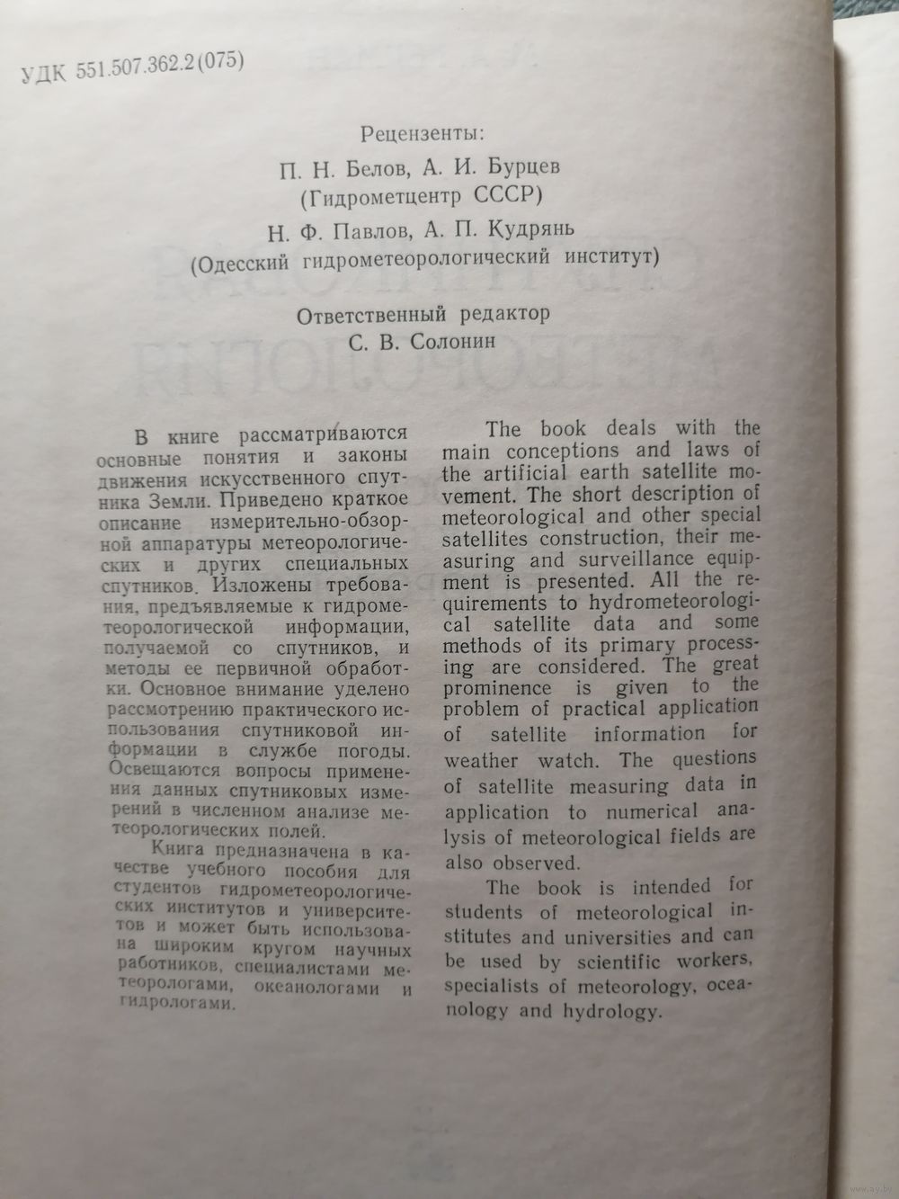 В книге рассматриваются основные понятия и законы движения искусственного спутника Земли. Приведено краткое описание измерительно-обзорной аппаратуры метеорологических и других специальных спутников. Изложены требования, предъявляемые к гидрометеорологической информации, получаемой со спутников, и методы ее первичной обработки. Основное внимание уделено рассмотрению практического использования спутниковой информации в службе погоды. Освещаются вопросы применения данных спутниковых измерений в численном анализе метеорологических полей.