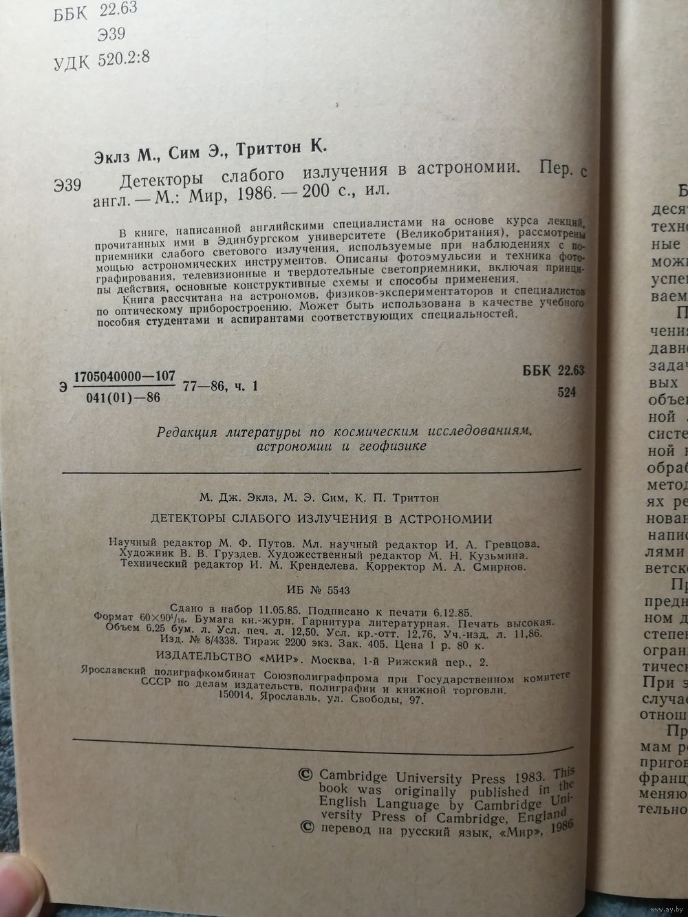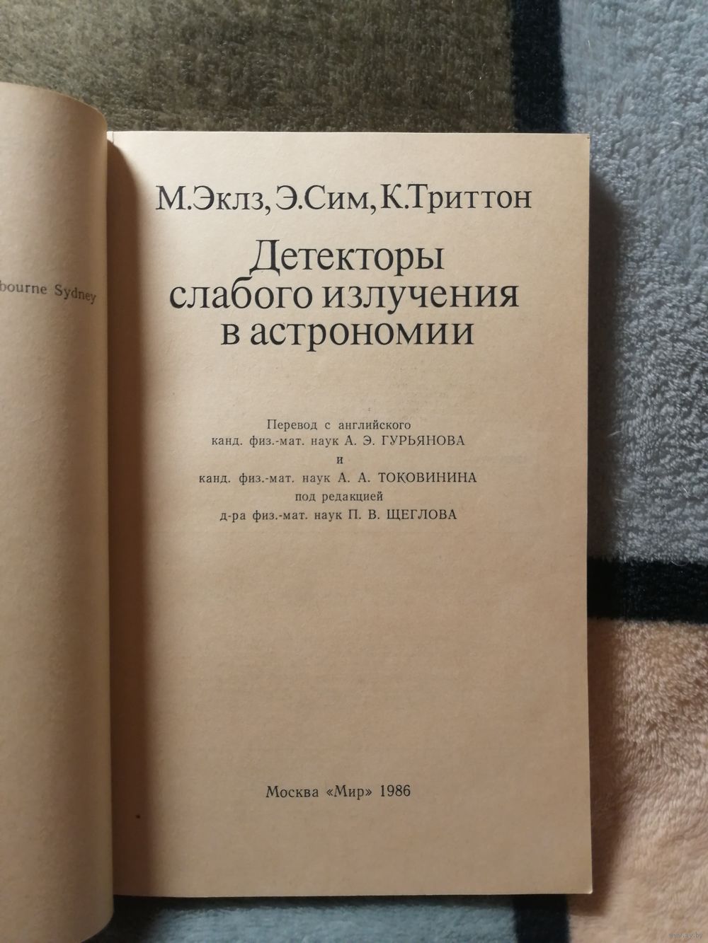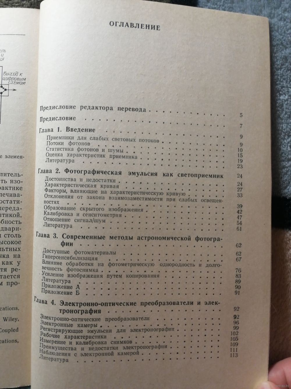 В книге, написанной английскими специалистами на основе курса лекций, прочитанных ими в Эдинбургском университете (Великобритания), рассмотрены приемники слабого светового излучения, используемые при наблюдениях с помощью астрономических инструментов. Описаны фотоэмульсии и техника фотографирования, телевизионные и твердотельные светоприемники, включая принципы действия, основные конструктивные схемы и способы применения.