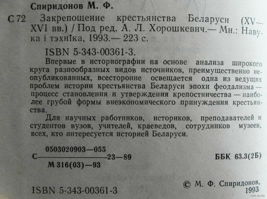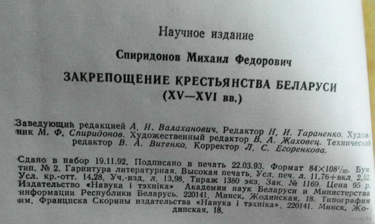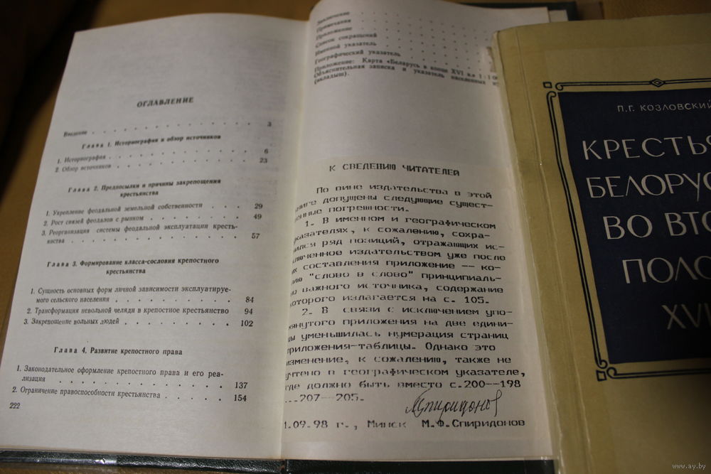 Две уникальные монографии, посвященные исследованию крестьянства Беларуси, обе первые в своем роде и пожалуй единственные!!! М.Ф. Спиридонов скандально известная монография "Закрепощение крестьянства Беларуси в XV-XVI веках", АВТОГРАФ АВТОРА, эту книгу рецензировали сразу 6 рецензентов, вместо положенных 2, четыре - основной текст и 2 - карты. Помимо этого, издательство при выпуске книги допустило ряд правок не согласовав их с автором, что вызвало резкую редакцию автора, в книге присутствует специальная вклейка с обвинениями в адрес издательства за подписью М.Ф. Спиридонова. Тираж книги - 1380 экземпляров!!!