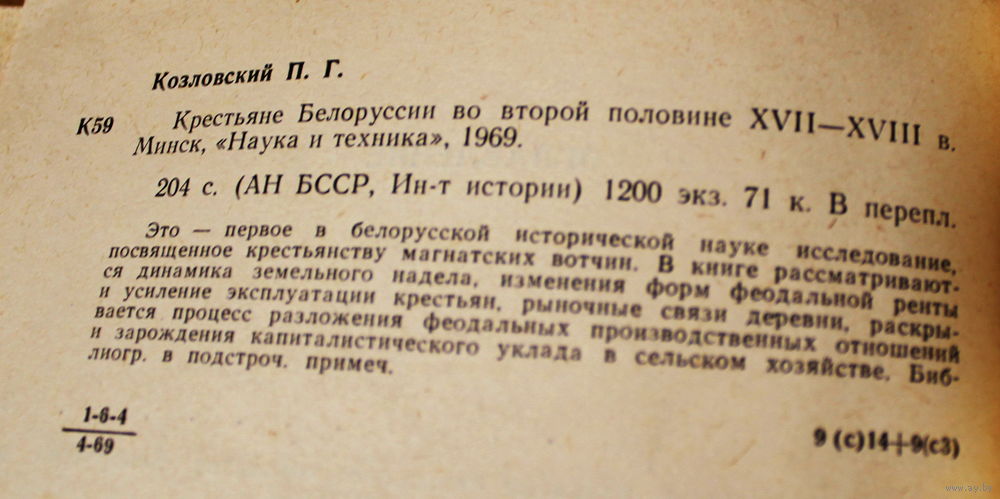 П.Г. Козловский монография "Крестьяне Белоруссии в XVII-XVIII веках" - первое научная монография посвященная правовому положению крестьян Беларуси, тираж 1200 экземпляров!!!