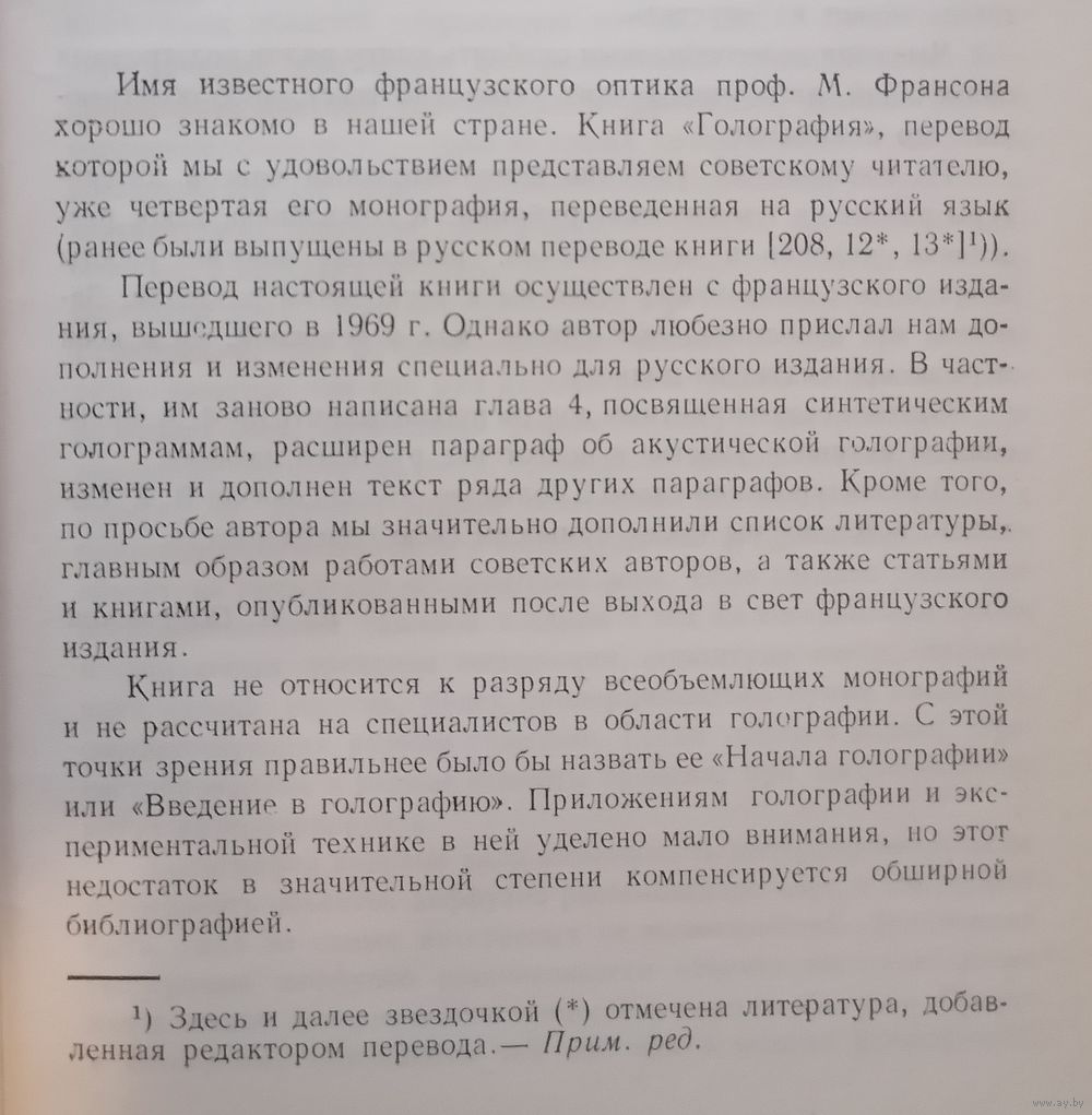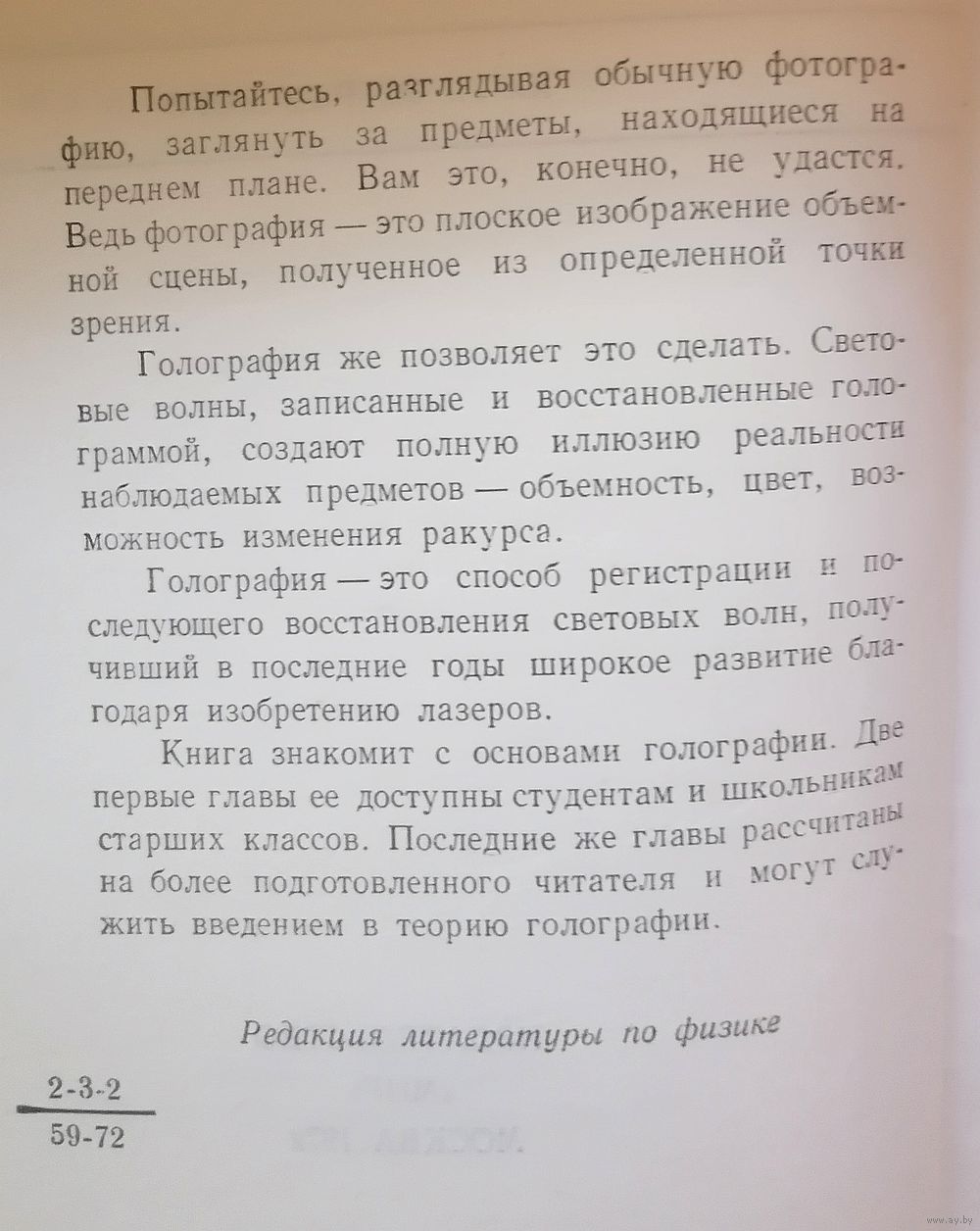 Попытайтесь, разглядывая обычную фотографию, заглянуть за предметы, находящиеся на переднем плане. Вам это, конечно, не удается. Ведь фотография - это плоское изображение объемной сцены, полученное из определенной точки зрения. Голография же позволяет это сделать. Световые волны, записанные и восстановленные голограммой, создают полную иллюзию реальности наблюдаемых предметов - объемность, цвет, возможность изменения ракурса. Голография - это способ регистрации и последующего восстановления световых волн, получивший в последние годы широкое развитие благодаря изобретению лазеров. Книга знакомит с основами голографии. Две первые главы ее доступны студентам и школьникам старших классов. Последние же главы рассчитаны на более подготовленного читателя и могут служить введением в теорию голографии.