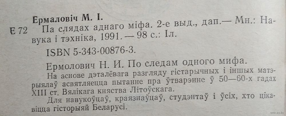 М. І. Ермаловіч. Па слядах аднаго міфа. 2-е выд. Мінск : Навука і тэхніка, 1991 г. 92 с. Мяккая вокладка.