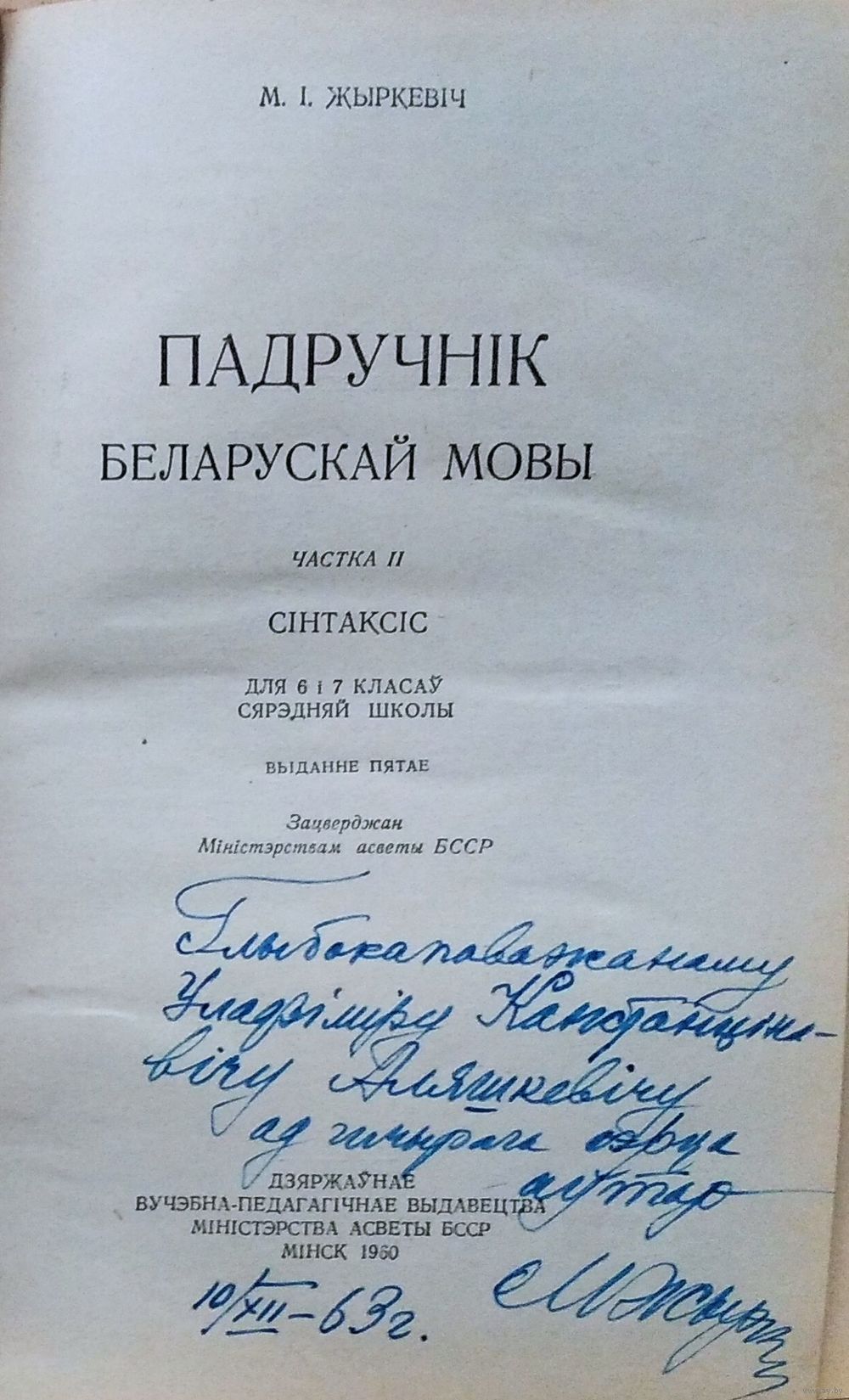 М. І. Жыркевіч. Падручнік беларускай мовы. Ч. 2 : Сінтаксіс : для 7-х і 8-х класаў. Аўтограф аўтара. Выд. 7-е. Мінск : Дзяржаўнае вучэбна-педагагічнае выдавецтва БССР. 1960 г. 152 с. Цверды пераплет.