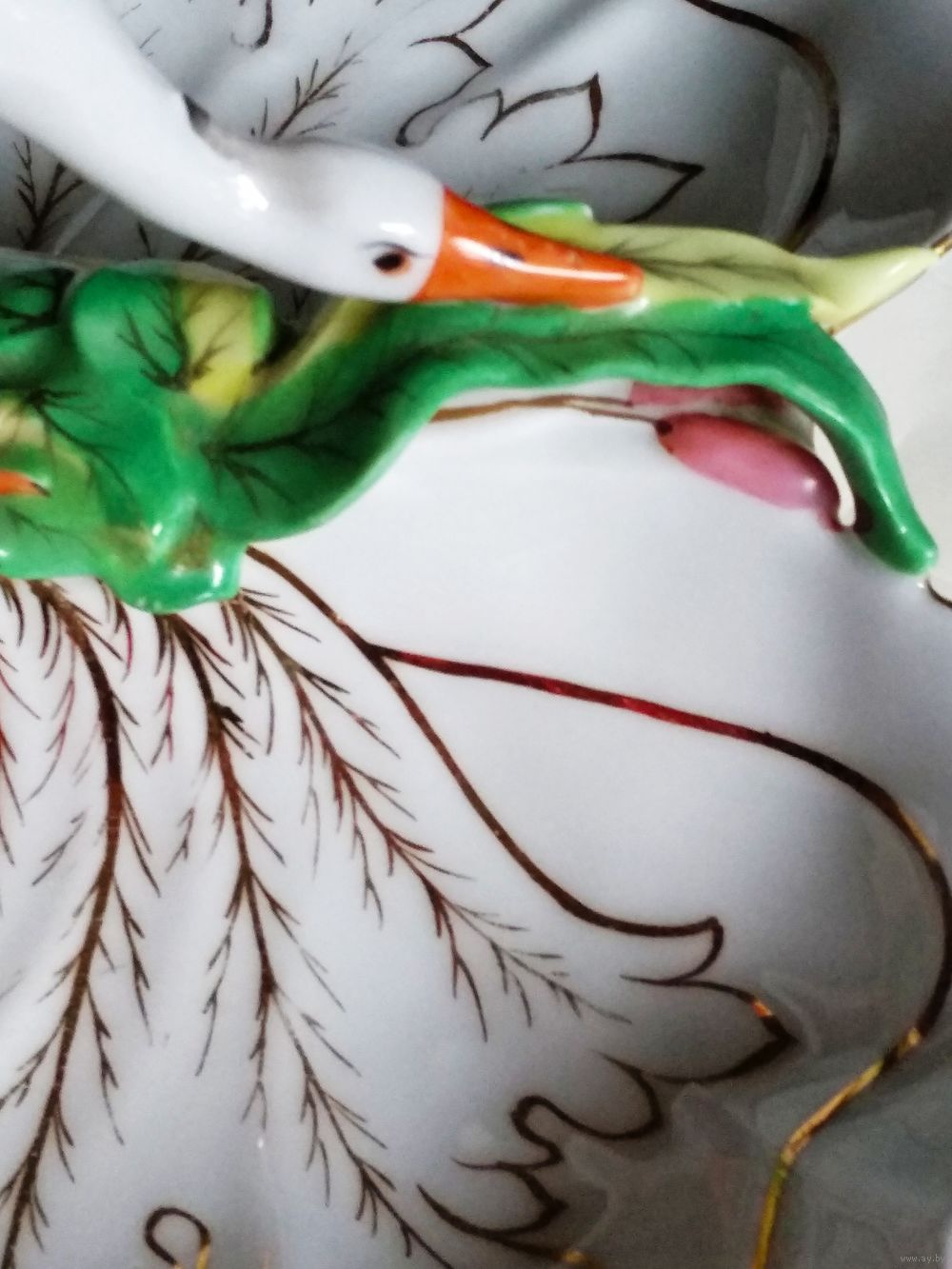 | без паутины и трещин глазури,позолота несильно потерта по ободку,имеються небольшие трещинки на обратной стороне,скол около 5мм кончика листа,качество как на фото | |