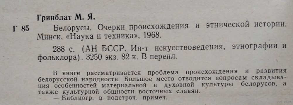М. Я. Гринблат. Белорусы: очерки происхождения и этнической истории. Минск : Наука и техника, 1968 г. 285 c. Твердый переплет.