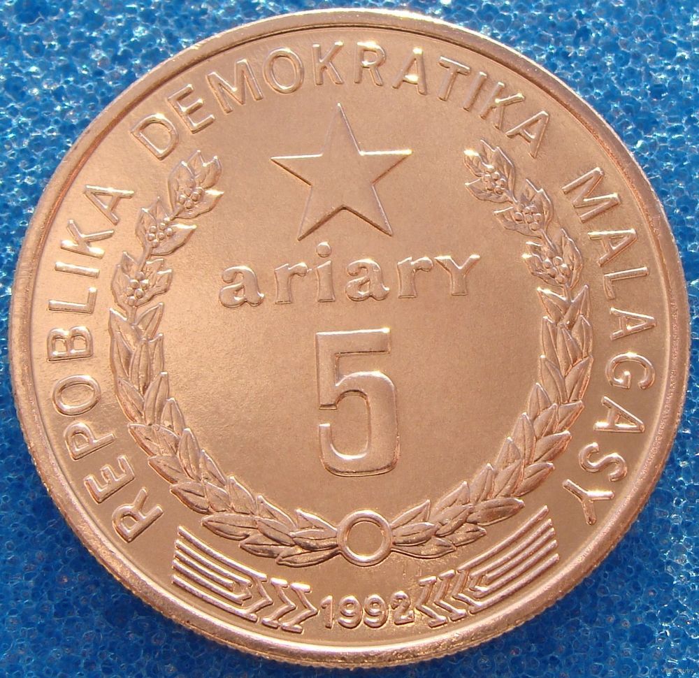 ///////// Доброго времени суток, спасибо, что заглянули в мой лоток!!! ///////// Данный лот выставлен на продажу как предмет коллекционирования и не является пропагандой чего бы то ни было, а также не является валютной сделкой!!!! Важно - Участникам торгов с отрицательным, нулевым или низким рейтингом просьба подтвердить намерения покупки лота по телефону или в обсуждениях лота. Лицам ранее не выкупившим у меня лоты, просьба ставки не делать, иначе они будут удалены. К Участию в торгах не допускаются лица не прошедшие верификацию на сайте. Продавец, сохраняет за собой право, снять ставку участника или отказать в продаже лота, если у продавца имеются подозрения в недобросовестности покупателя или отрицательные отзывы. Отправка обычным письмом, конвертом 1-ого класса, мелким пакетом (посылкой, бандеролью) с наложенным платежом и предоплата "на телефон" не рассматривается!!! В случае невыхода на связь или немотивированного отказа от покупки лота(ов), буду вынужден поставить отрицательный отзыв и переставить лот(ы). ////////// Информация: WWC номер KM # 17 Страна: Мадагаскар Период: Республика Мадагаскар (1965 - 2021) Валюта: Малагасийский ариари Вид чекана: Регулярный чекан Номинал: 5 ариари Год: 1992 Материал: Сталь с медным покрытием Гурт: Рубчатый Форма: Круг Отношение авс/рев: Монетное (180°) Вес (g) 4.5 Диаметр (mm) 24.0 Толщина (mm) 1.45 //////// Состояние монеты на фото //////// Описание: Моя оценка состояния может не совпадать с вашей. Внимательно изучите фотографию!!!