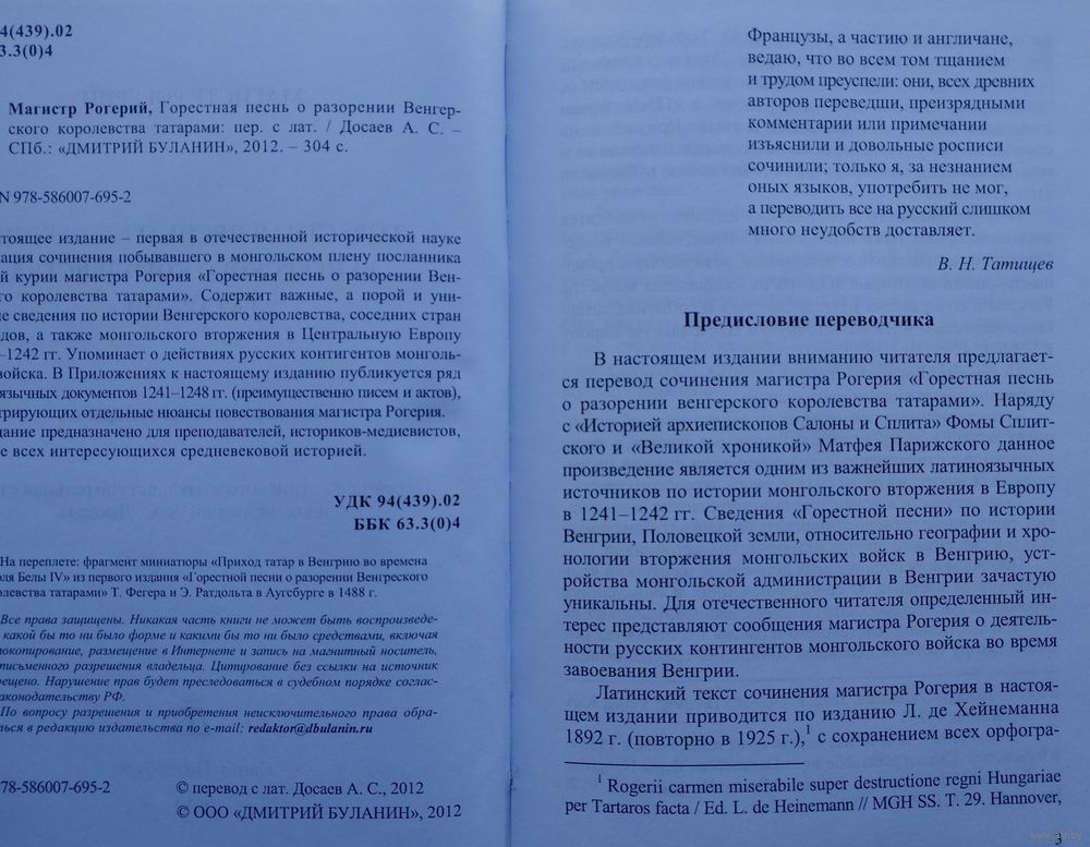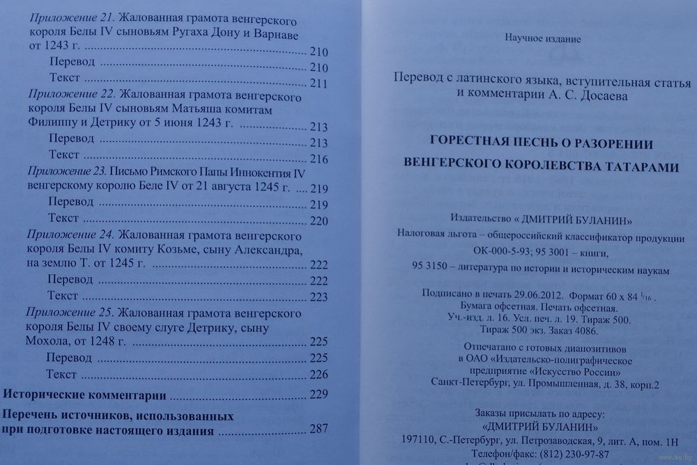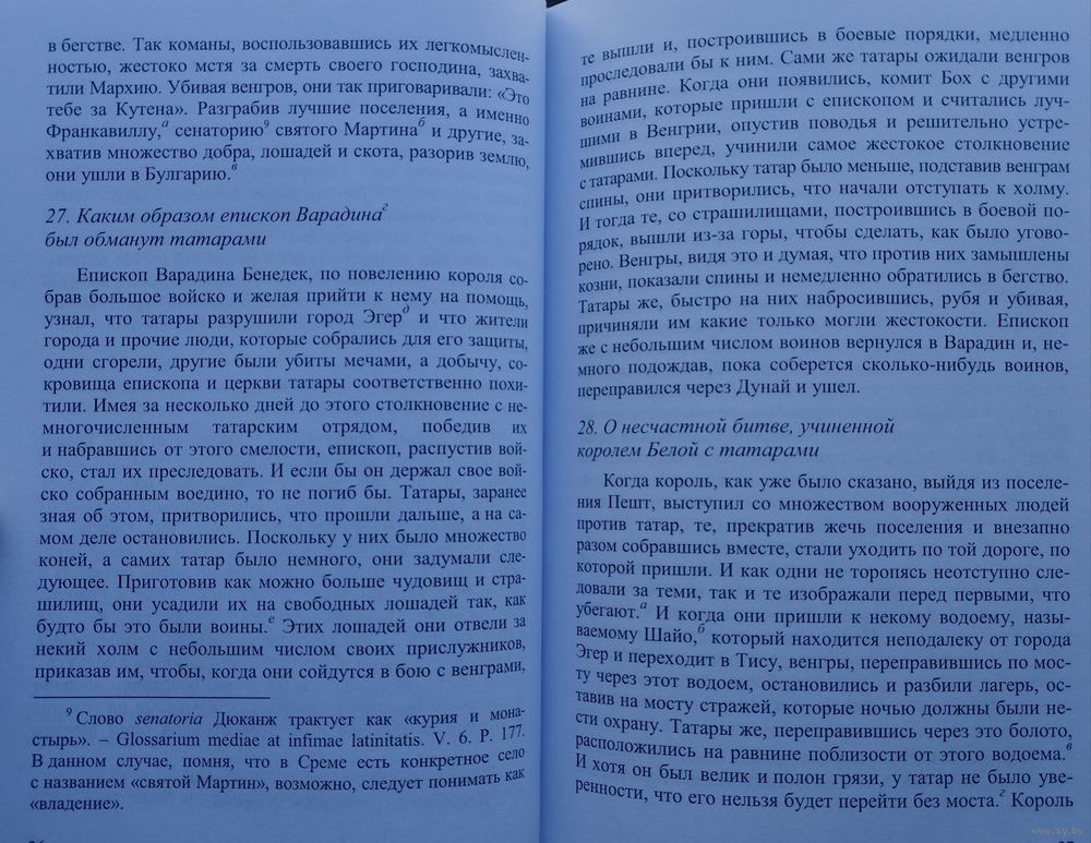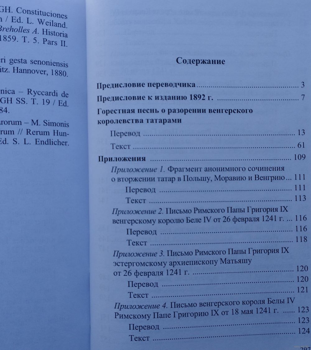 Большой формат. Тираж 500 экз. 304 стр. Параллельный латинский текст с русским переводом. Настоящее издание - первая в отечественной исторической науке публикация сочинения побывавшего в монгольском плену посланника папской курии магистра Рогерия «Горестная песнь о разорении Венгерского королевства татарами». Содержит важные, а порой и уникальные сведения по истории Венгерского королевства, соседних стран и народов, а также монгольского вторжения в Центральную Европу в 1241-1242 гг. Упоминает о действиях русских контингентов монгольского войска. В Приложениях к настоящему изданию публикуется ряд латиноязычных документов 1241-1248 гг. (преимущественно писем и актов), иллюстрирующих отдельные нюансы повествования магистра Рогерия.