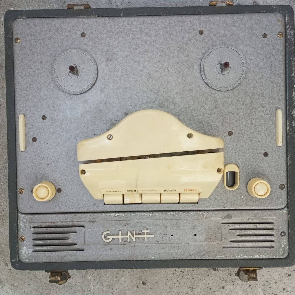 Электрическая часть: звук есть. Механика: пассики тонвала и перемотки восстановлены склейкой. Перемотка и воспроизведение работают. Прижимной ролик заменен на ролик от Маяк 201. Отсутствуют 4 буквы из названия магнитофона: A, R, A, S. Даты пр-ва радиоламп: 1962, 1965