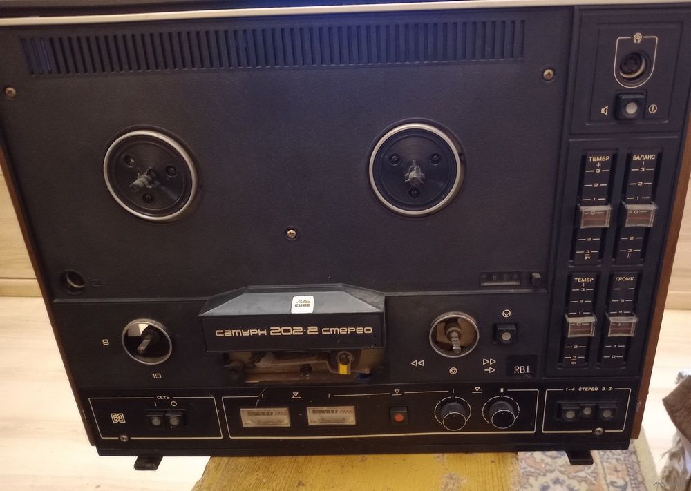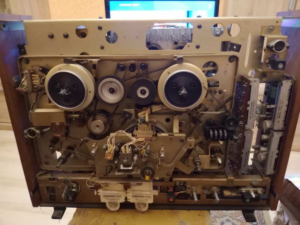 Состояние на фото. Нет верхней прозрачной крышки, нижней крышки блока головок, ручек переключения режимов и скорости, шнура питания, двух верхних крышек держателей предохранителей, остальное всё на месте. Все вопросы задаём до покупки. Не копанный, под восстановление. Все режимы работают, перемотки, переключения скорости, пауза, автостоп, воспроизведение ( очень тихо). Режим записи не проверял.