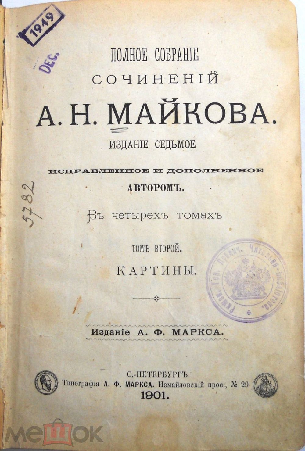 Т. 2. Картины. (Стихотворения.) VIII, 560 с., 1 л. факс. Т. 3. Поэмы [и др.]. 4, II, 506 с. 18,5Х13,5Х2,5 см. Издательские переплеты. Т. 2 - На титульном листе дореволюционная печать, а передний форзац в дореволюционных штампах. Форзац в конце книги реставрирован. В оглавлении перепутаны страницы. деньги: банковская карта или банковский перевод.