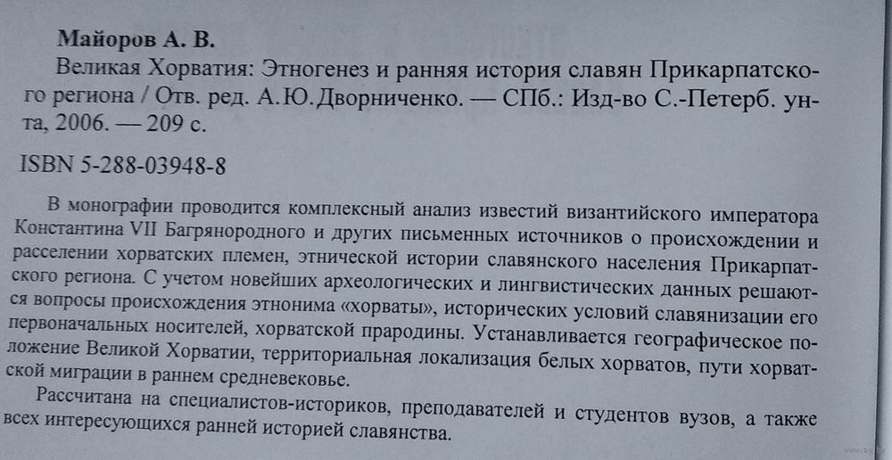 Майоров А.В. Великая Хорватия: Этногенез и ранняя история славян Прикарпатского региона. Отв. ред. А.Ю.Дворниченко. СПб. СПбГУ. 2006г. 208 с. Твердый переплет, Энциклопедический формат.