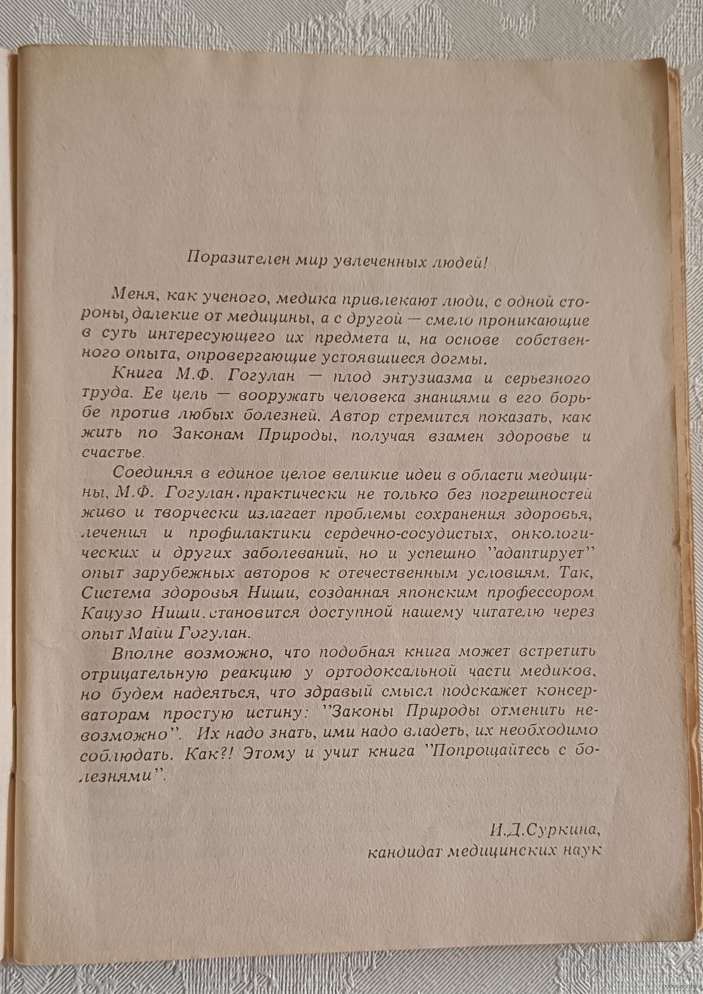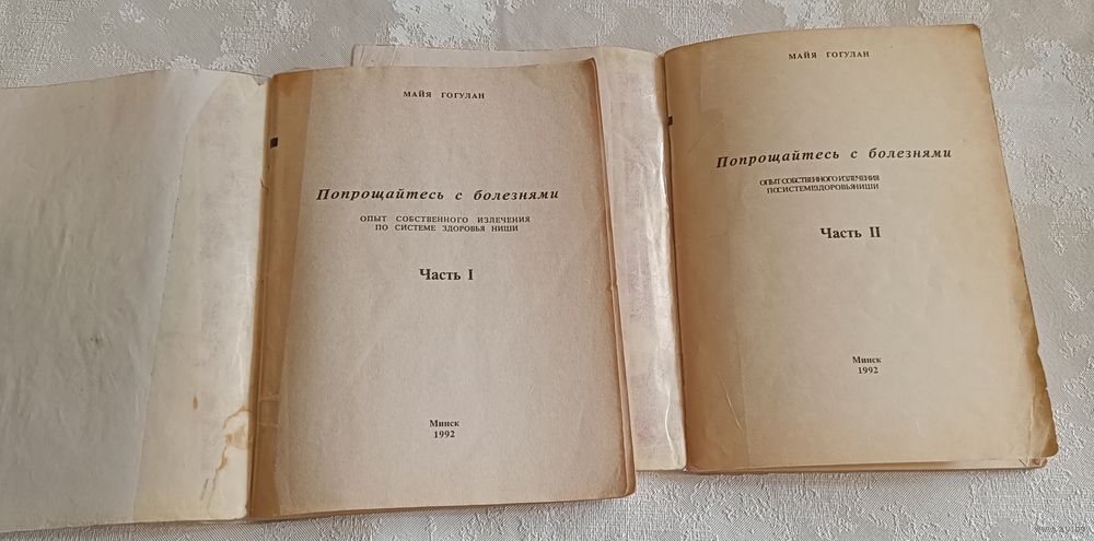 Майя Гогулан. Попрощайтесь с болезнями в 2х частях. Мн., 1991, стр. 72+ 74, мягкая обложка, обычный формат.Майя Гогулан, журналист, которая сама прошла через болезнь и нашла выход, используя систему здоровья японского инженера Кацудзо Ниши.