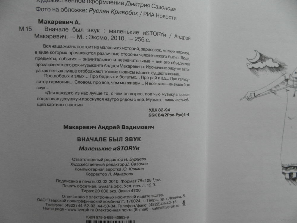Вся наша жизнь состоит из маленьких историй, зарисовок, мелких штрихов, в виде которых проявляются различные стороны человеческого бытия. Люди, предметы, события - значительные и незначительные - все это объединяет проза известного рок-музыканта Андрея Макаревича. Ироничные рисунки автора как нельзя лучше отображают тонкие нюансы нашего существования. Про добрых и злых... Про бедных и богатых... Про рай и ад... Про калькулятор гармонии... Словом, про все, чем мы живем... И все-таки - вначале был звук... «Для каждого из нас лучше то, с чем он вырос, под чью музыку впервые поцеловал девушку и проснулся наутро рядом с ней. Музыка - лишь часть общей картины счастья».