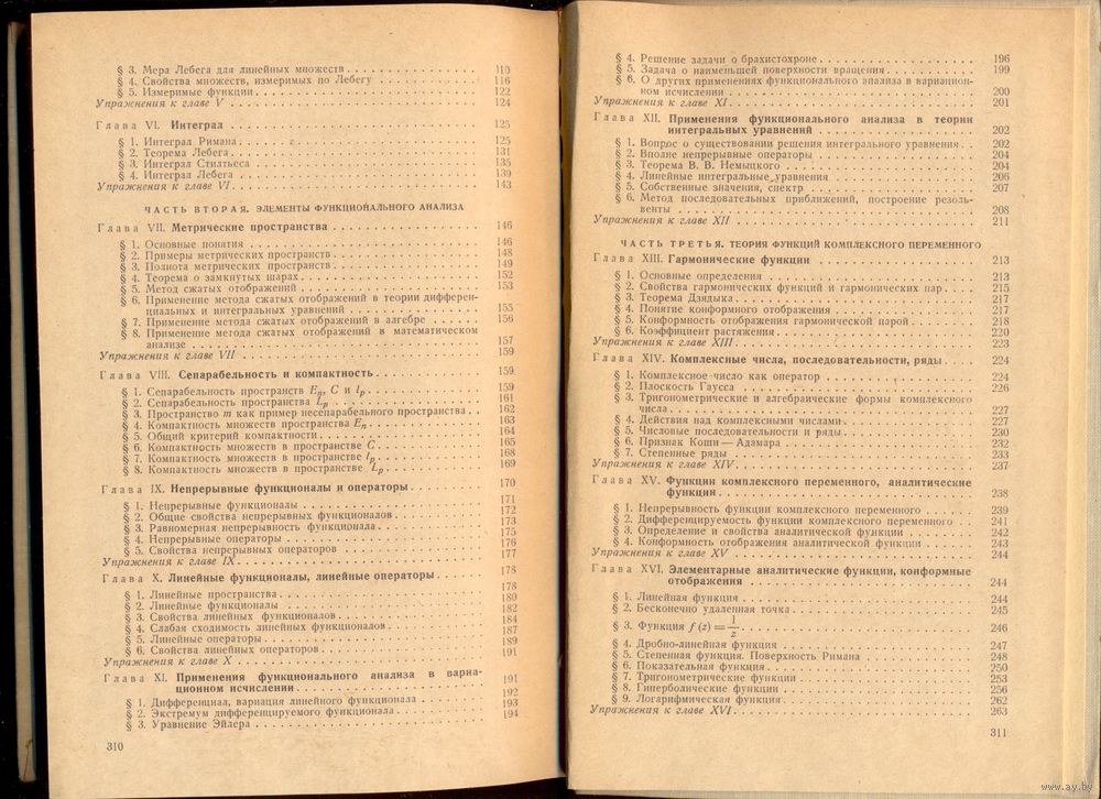 В книге излагаются современная теория множеств и на ее основе теория функций действительного переменного, теория функций комплексного переменного и основы функционального анализа. В отдельных главах даются применения функционального анализа в вариационном исчислении и теории интегральных уравнений, применения теории функций комплексного переменного (в том числе в картографии, гидро- и аэромеханике).