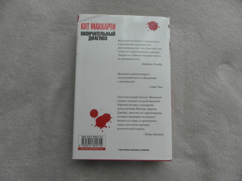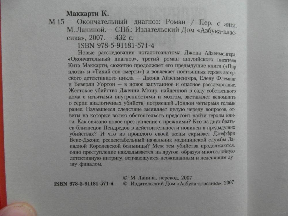 Новые расследования патологоанатома Джона Айзенменгера. `Окончательный диагноз`, третий роман английского писателя Кита Маккарти, сюжетно продолжает его предыдущие книги (`Пир плоти` и `Тихий сон смерти`) и вовлекает постоянных героев авторского детективного цикла - Джона Айзенменгера, Елену Флеминг и Беверли Уортон - в новое запутанное и опасное расследование. Жестокое убийство Дженни Мюир, найденной в саду собственного дома с изъятыми внутренностями и мозгом, заставляет вспомнить о серии аналогичных убийств, потрясшей Лондон четырьмя годами ранее. Начавшееся следствие выявляет целую череду вопросов, ответы на которые волею обстоятельств предстоит найти героям книги. Как связано новое преступление с прежними? Кто из двух братьев-близнецов Пендредов в действительности повинен в предыдущих убийствах? И что из прошлого своей жены скрывает Джеффри Бене-Джонс, респектабельный начальник медицинской службы Западной Королевской больницы? Меж тем убийства продолжаются, одно преступление накладывается на другое, образуя многослойную детективную интригу, венчающуюся неожиданным и леденящим душу финалом.