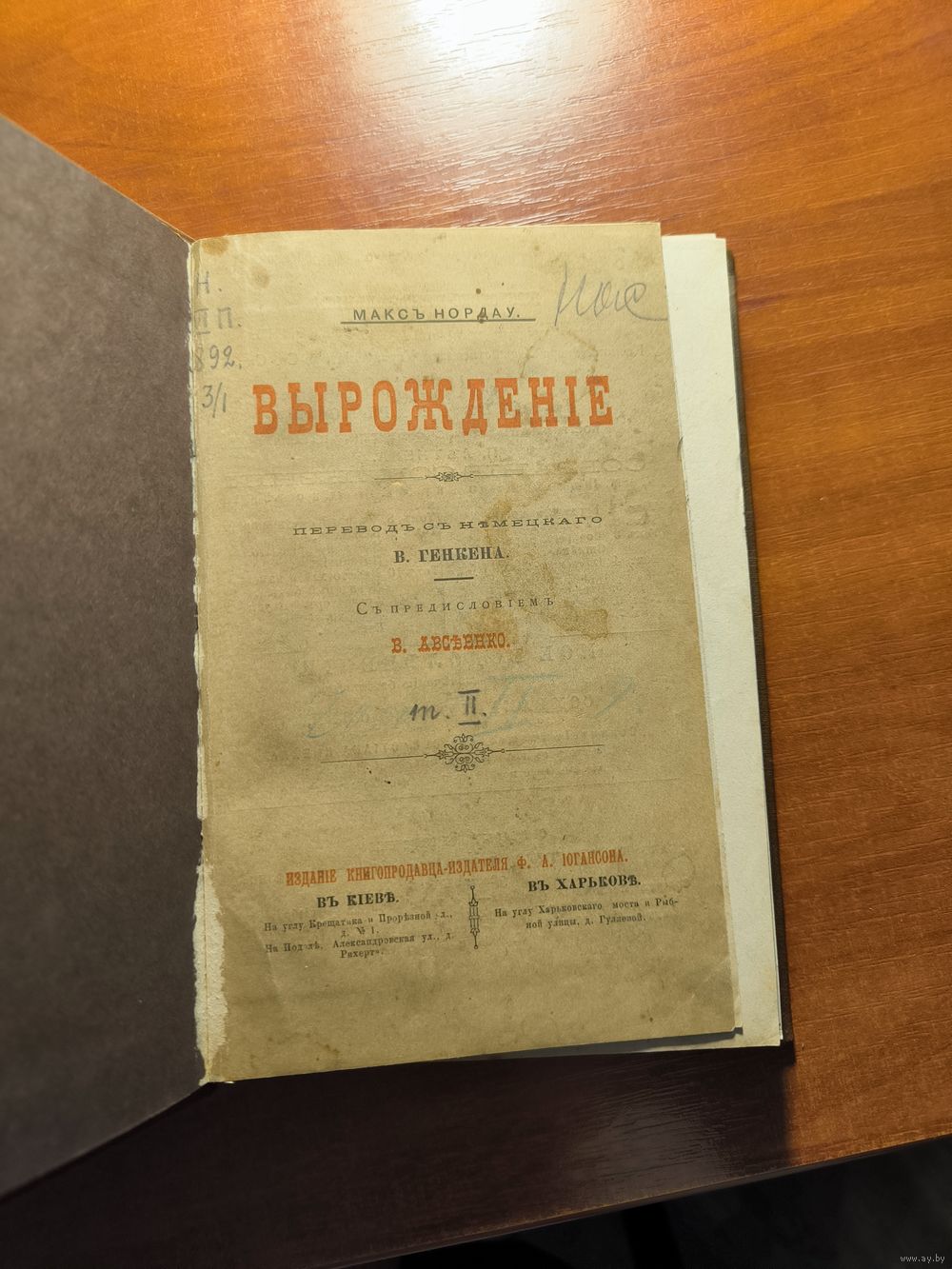 Русское издание философского труда Макса Нордау "Вырождение". В книге критикуется сложившаяся в Европе культура упадничества. Трудом вдохновлялись многие известные философы ХХ века, в их числе Альберт Розенберг, один известный австрийский художник и многие другие.