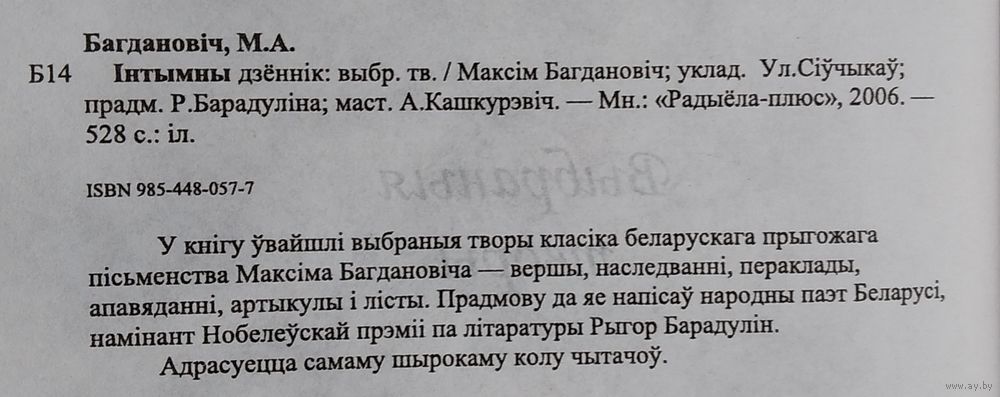 Максім Багдановіч. Інтымны дзённік: выбраныя творы. Мінск : Радыёла-плюс, 2006 г. 526 с. Цверды пераплет. Паменш. фармат. Супервокладка.