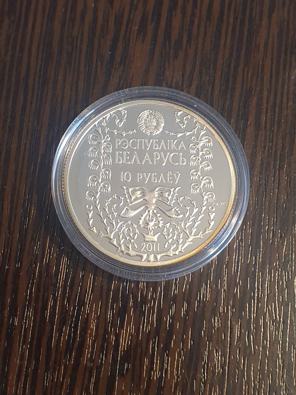 в обрамлении орнамента, использованного при оформлении сборника стихов "Венок", вверху – рельефное изображение Государственного герба Республики Беларусь, под ним надпись: РЭСПУБЛІКА БЕЛАРУСЬ и номинал 10 РУБЛЁЎ (на серебряной) и 1 РУБЕЛЬ (на медно-никелевой); внизу – год чеканки; справа (на серебряной монете) – проба сплава.