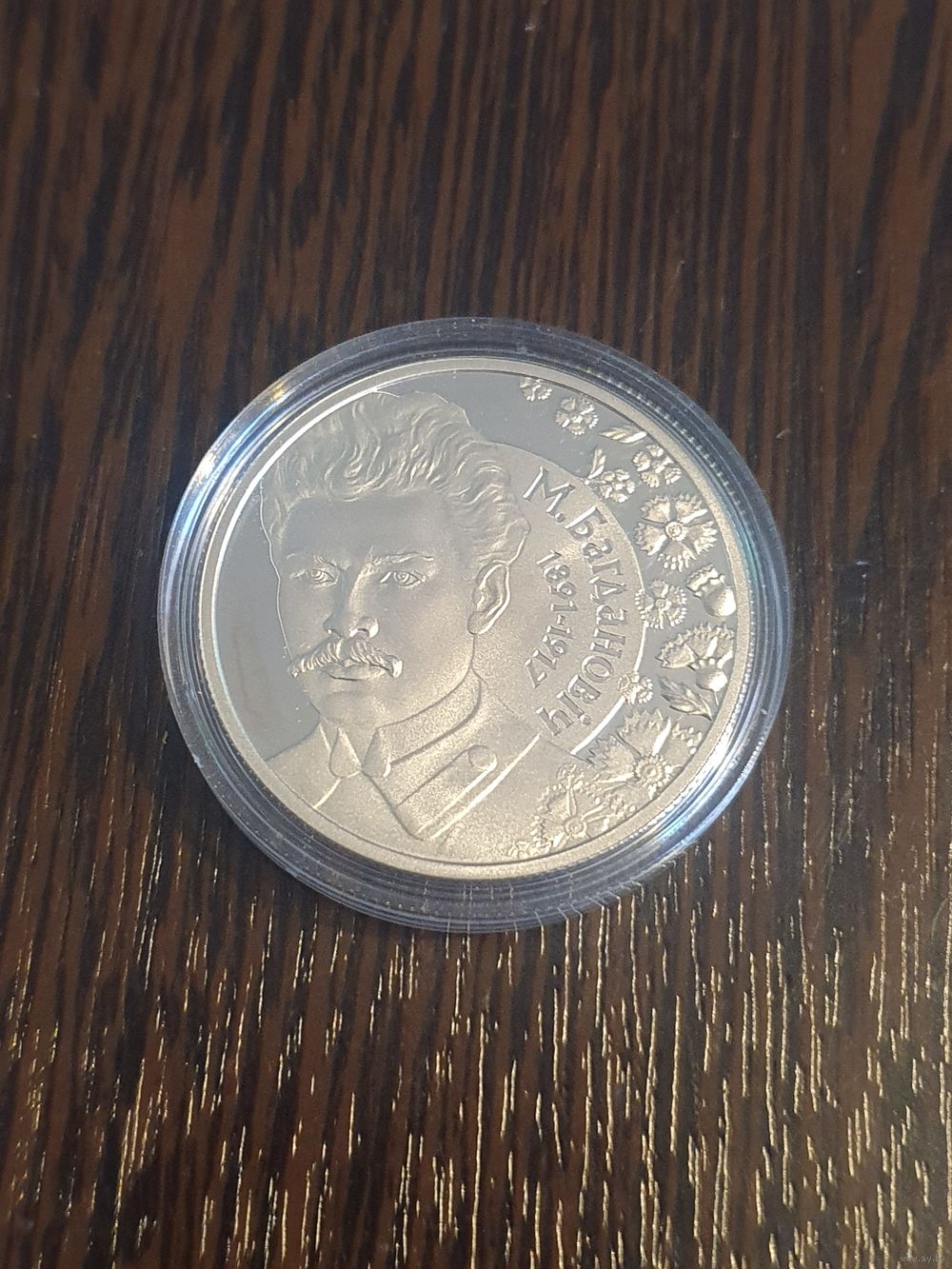 слева – рельефное изображение портрета классика белорусской литературы Максима Богдановича; справа по кругу в две строки надписи: М. Багдановіч, 1891—1917 (годы жизни) и орнаментальный мотив из васильков.