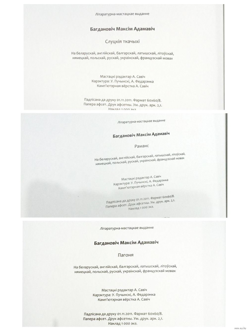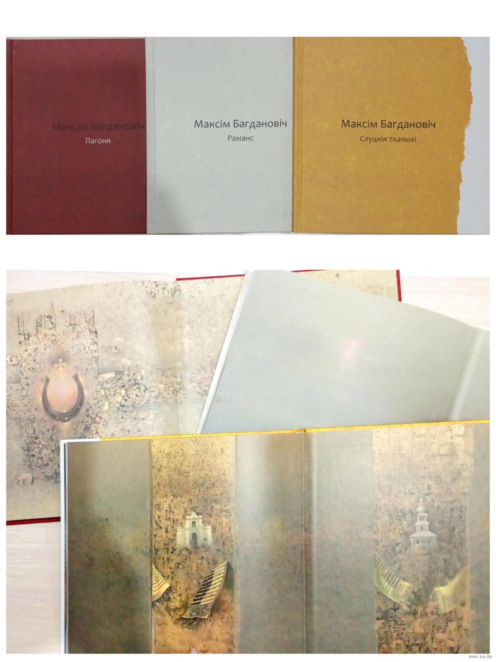 Юбілейнае выданне складаецца з трох кніг, прысвечаных вершам Максіма Багдановіча «Раманс», «Слуцкія ткачыхі», «Пагоня» на дзесяці мовах.