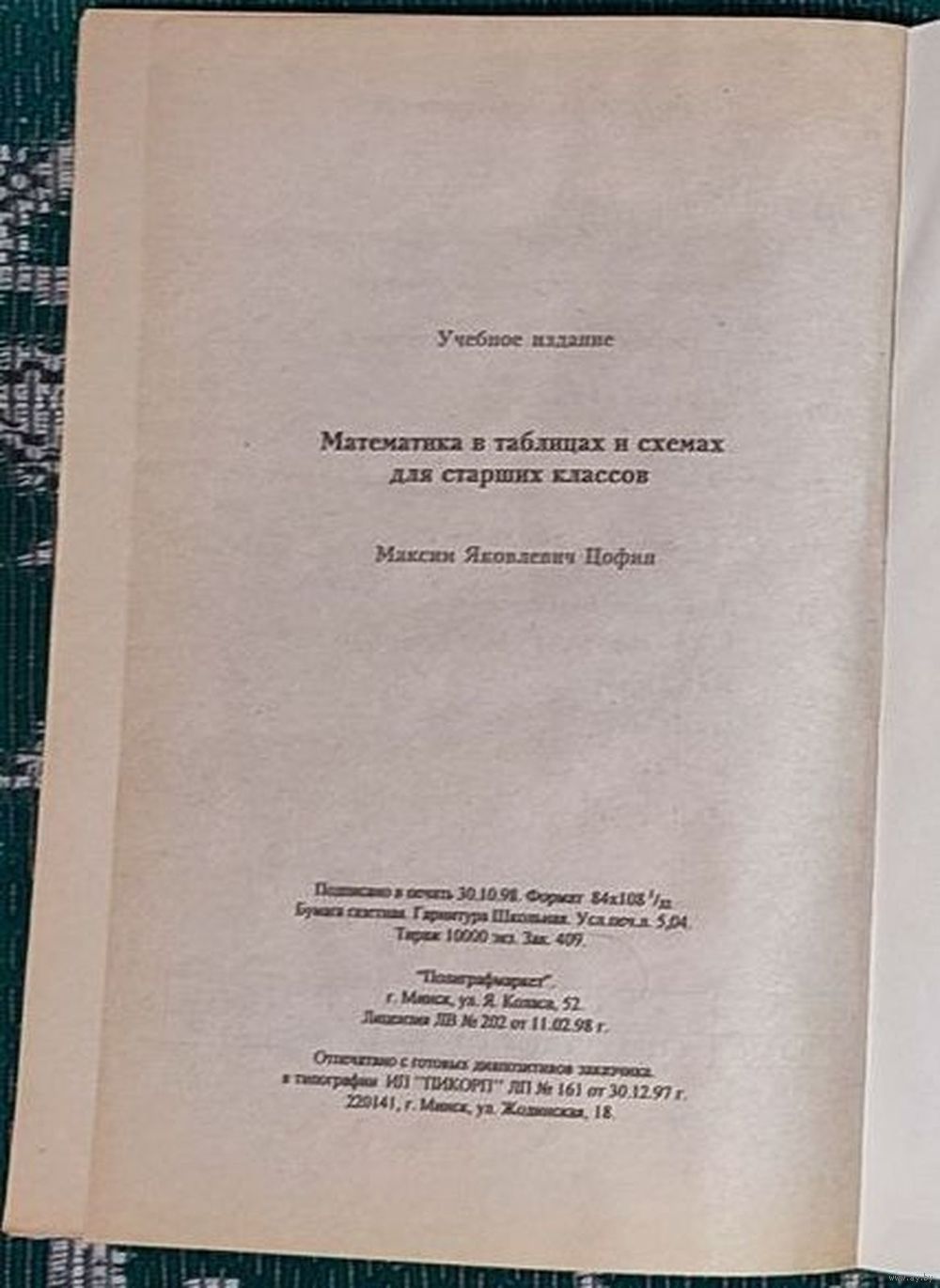 Пособие «Математика в таблицах и схемах для старших классов», автором которого является Максим Яковлевич Цофин, представляет собой компактный справочник для систематизации школьных знаний по предмету. Книга содержит основные определения, формулы и теоремы школьного курса математики, представленные в сжатом виде — через таблицы и графические схемы. Предназначена для быстрого повторения материала перед контрольными работами и экзаменами, поиска нужных формул и алгоритмов решения типовых задач, систематизации теоретических сведений по алгебре и геометрии