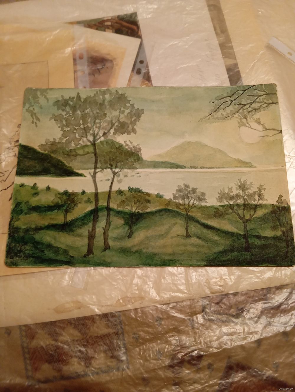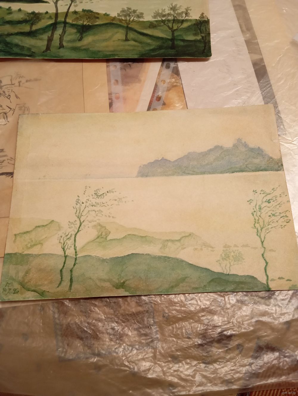 Лот состоит из двух акварельных рисунков 29,5 х 21 см. Бумага, акварельные краски. Структура старой бумаги отображена на фото. В левом углу рисунков стоит авторская подпись. Экспертиза подлинности рисунков и подписи не проводилась. На оборотной стороне первого рисунка стоит карандашная подпись Коктебель 1929 г. М. Волошин. На втором рисунке присутствует небольшой разрыв 0,5 см и на обороте остатки вклейки рисунка в альбом. Рисунки из личной коллекции.