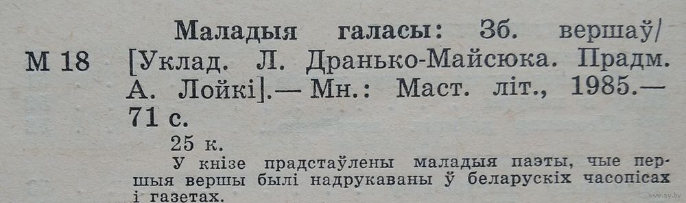 Маладыя галасы: зборнік вершаў. Укладанне Л. Дранько-Майсюка. Мінск : Мастацкая літаратура, 1985 г. 70 с. Мяккая вокладка.