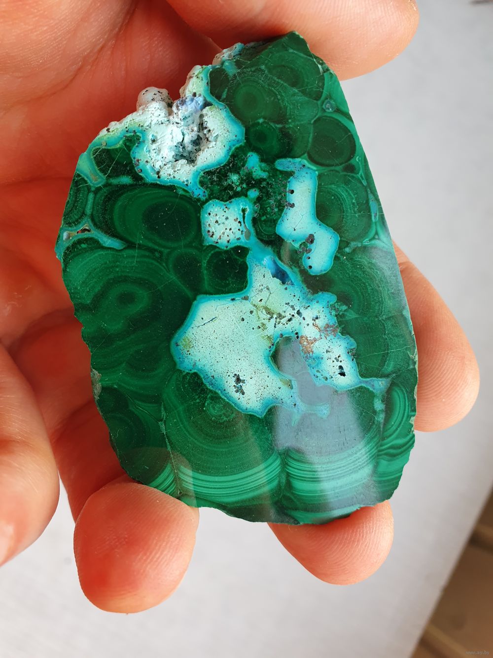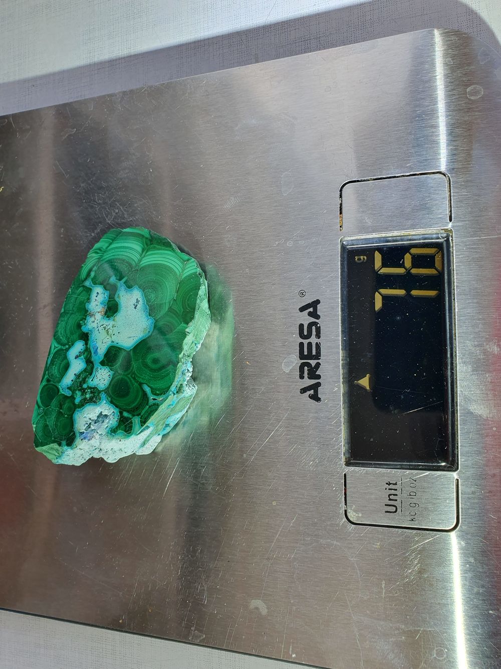 Интересный образец малахита с хризоколлой (лицевая полировка). Вес на фото.