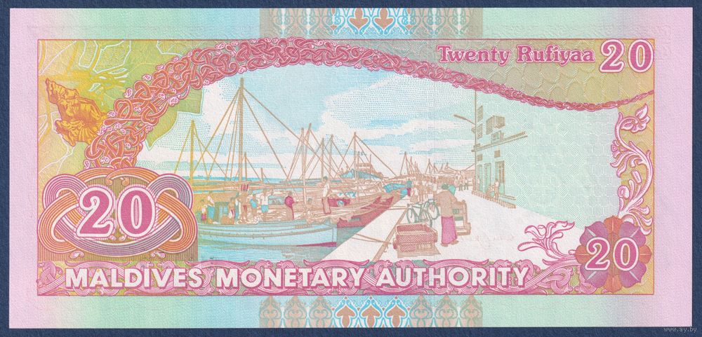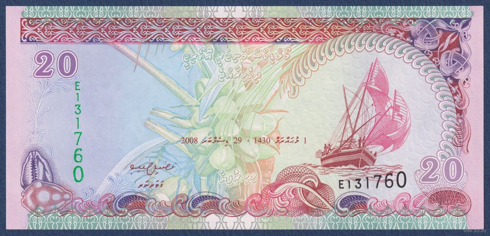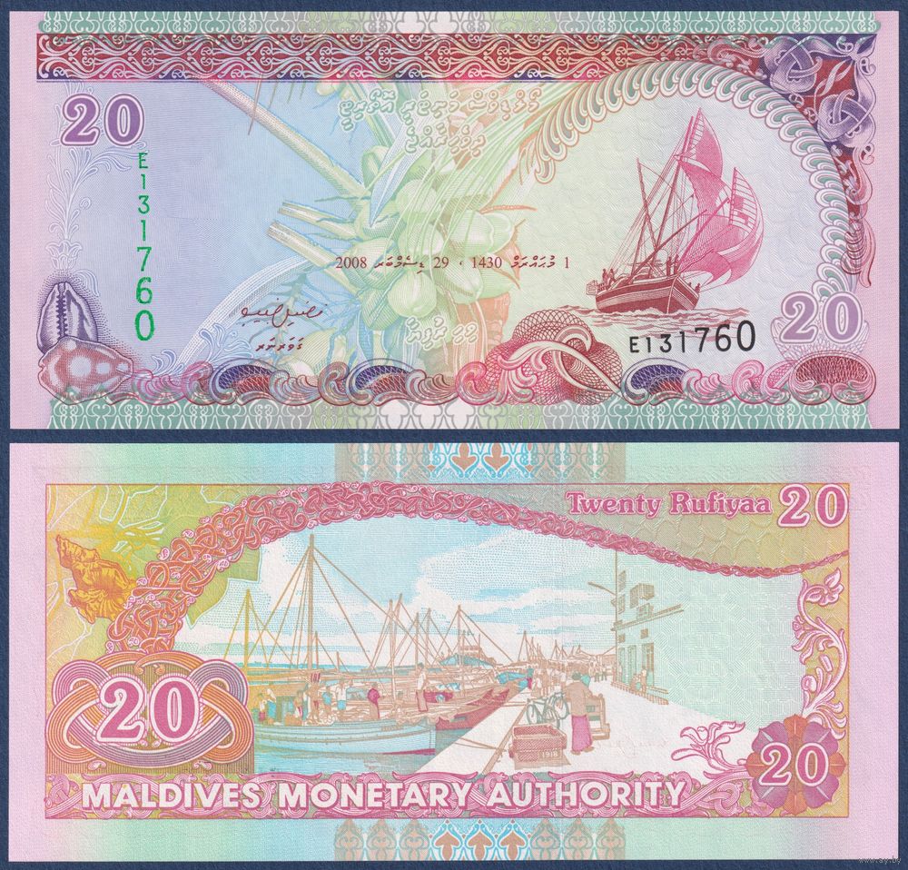 Мальдивские острова (Мальдивы), 20 руфий 2008 г, P-20c (E, лодка доу, гавань Мале), UNC