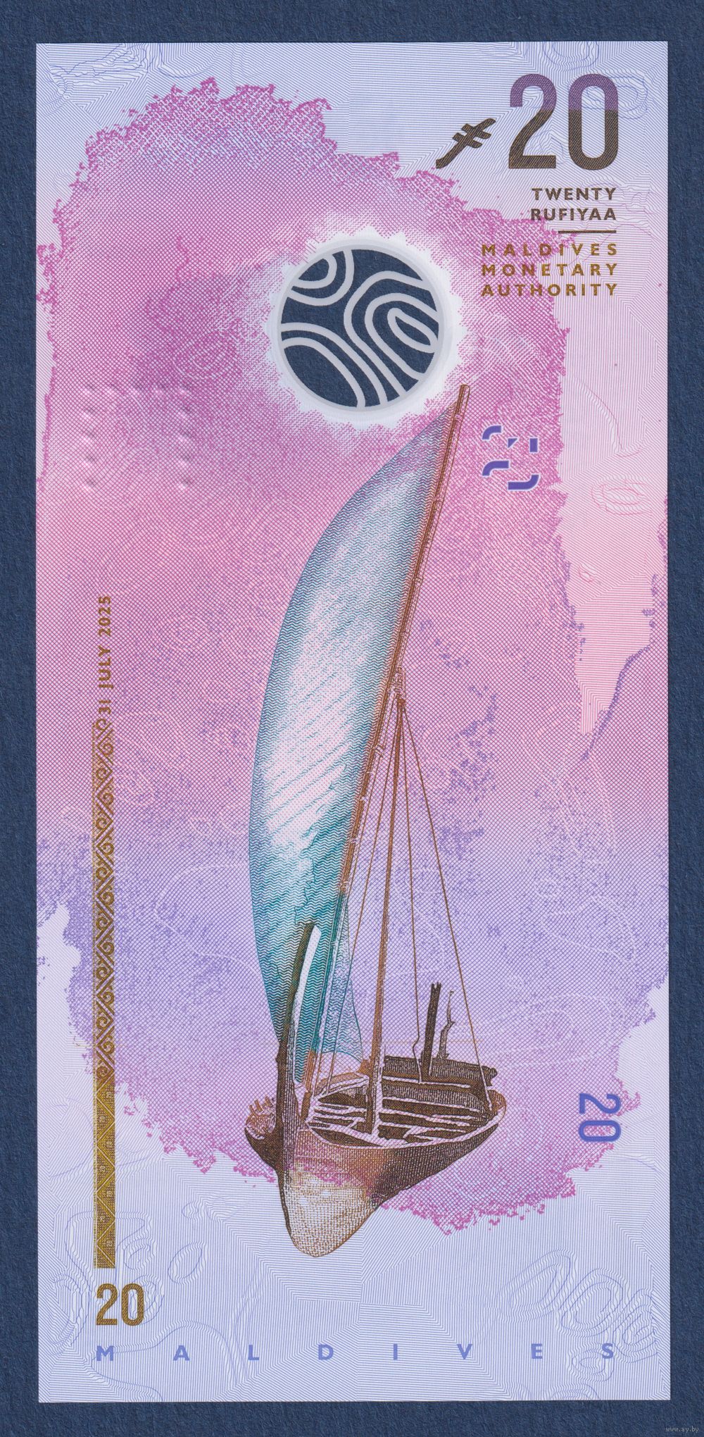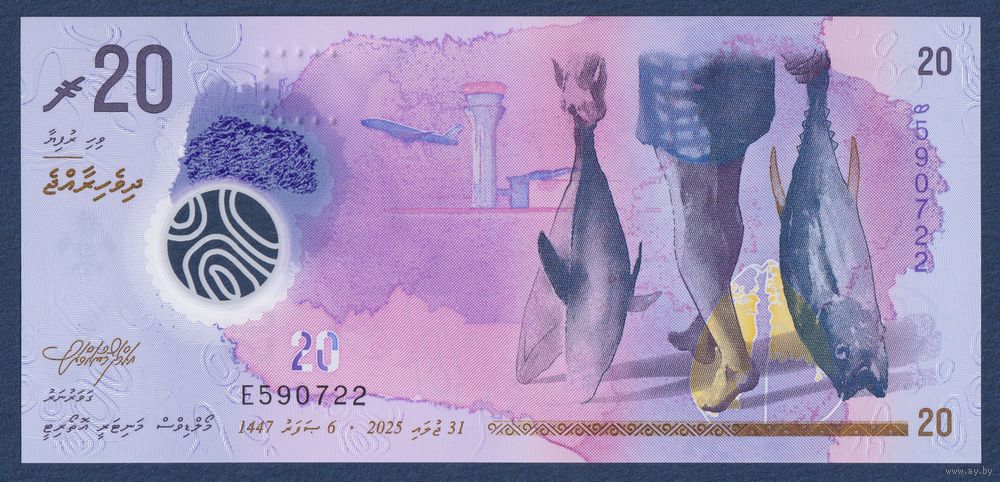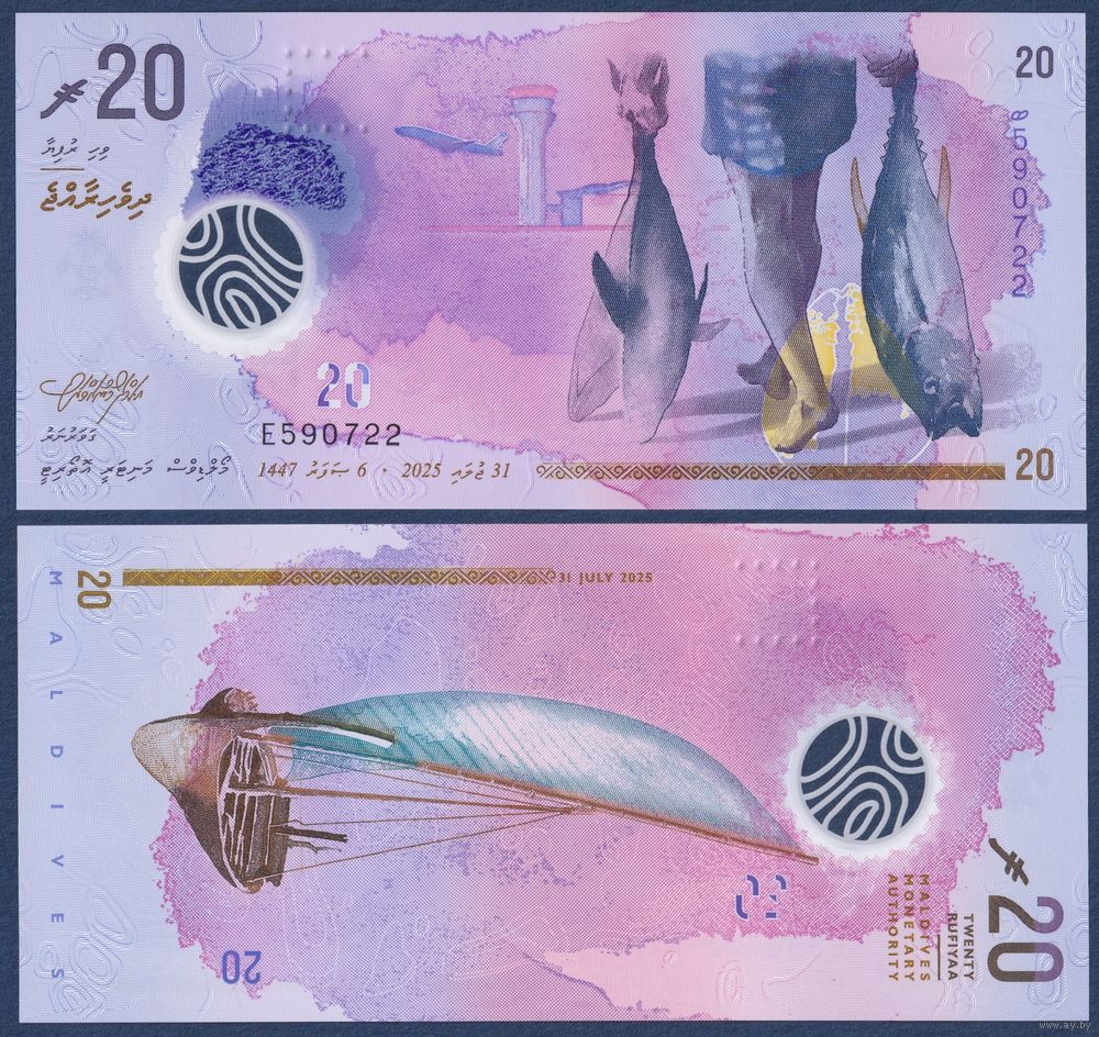 Мальдивы, 20 руфий 2025 г, P-W34 (E, полимер, рыбак с тунцом, парусная лодка дхони), UNC