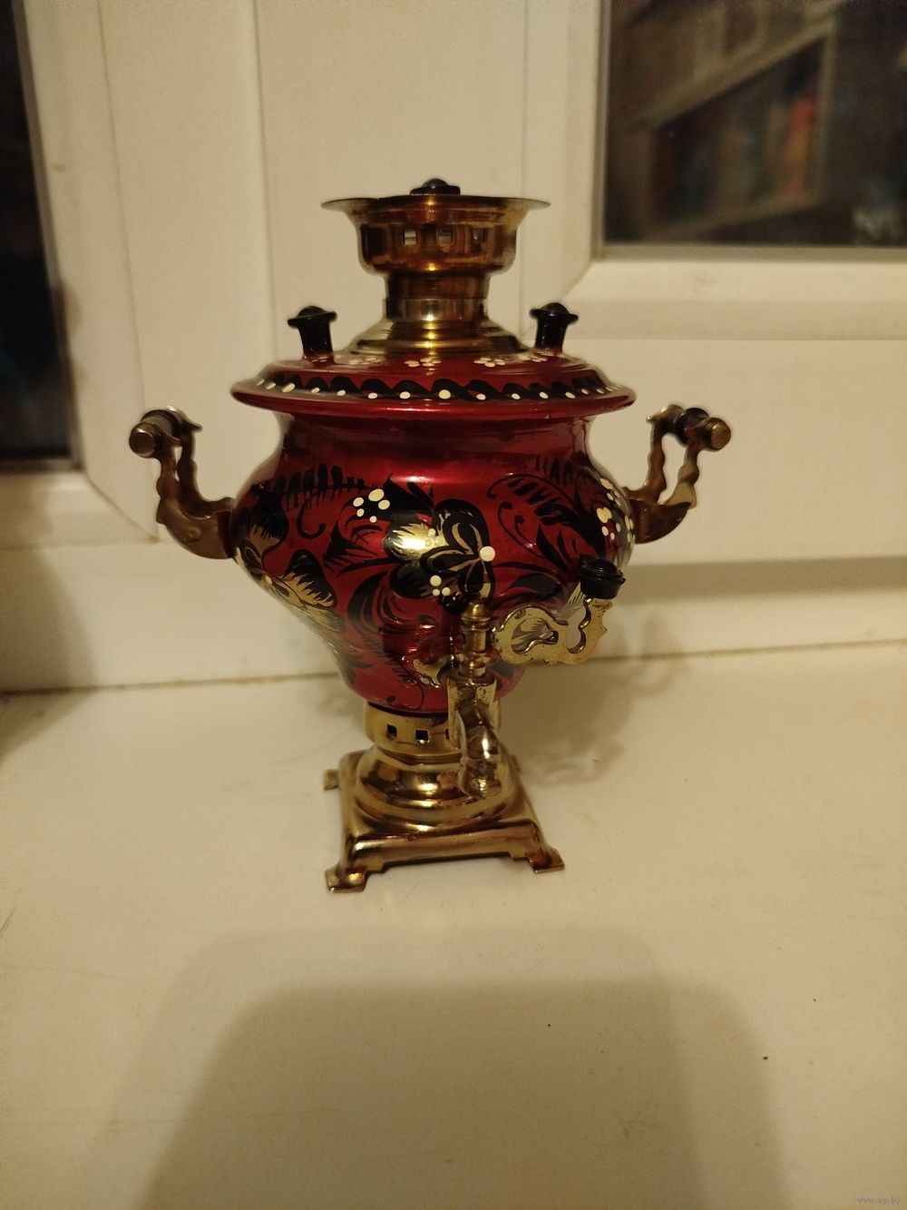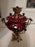 Маленький сувенирный самовар из Ясной Поляны из металла, бордового цвета, расписанный золотыми цветами с черным и белым декором. 2006 г.