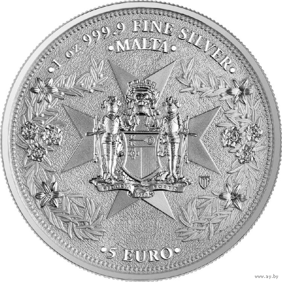 На реверсе монеты достоинством 5 евро в слитках изображено изображение Мальты, помещенное на венок, вдохновленный росписью на потолке дворца Великого магистра в Валлетте. Все это окружено оливковыми и пальмовыми ветвями - символом мира. Цветущие лилии символизируют величие и славу, в то время как розы являются атрибутом чистоты и гармонии. Это также первая монета, на которой нанесен знак монетного двора Германии.