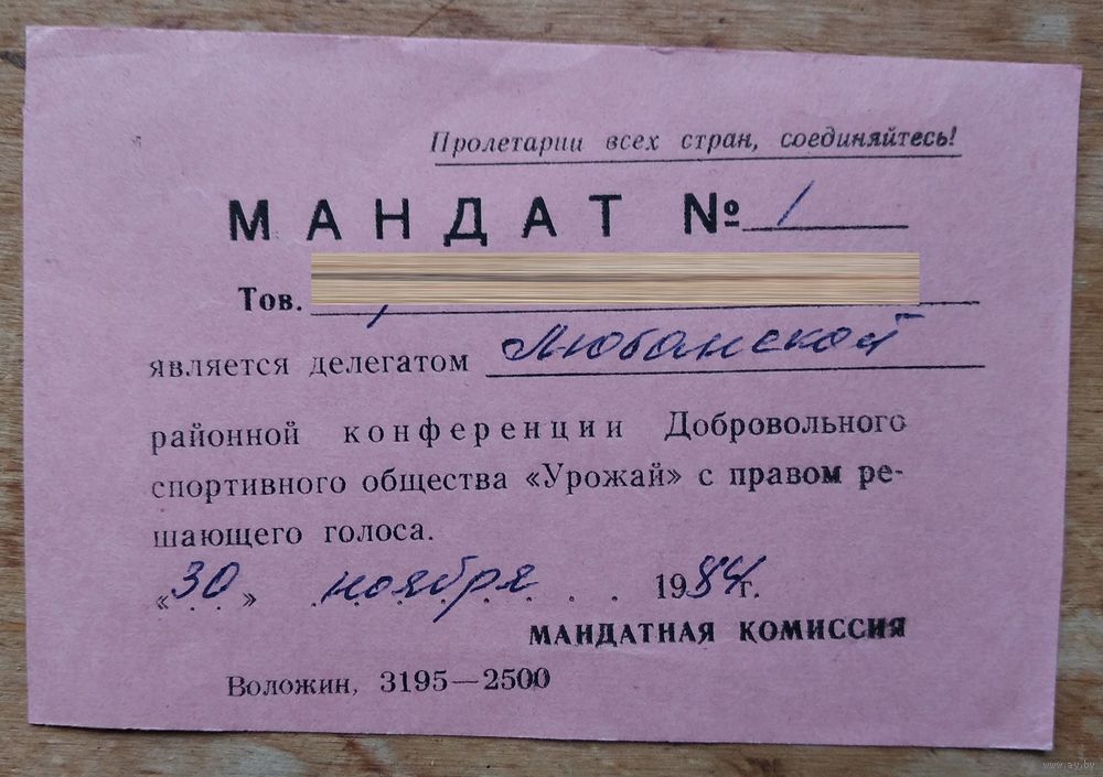 Мандат делегата областной конференции ДСО "Урожай". 1984 г.