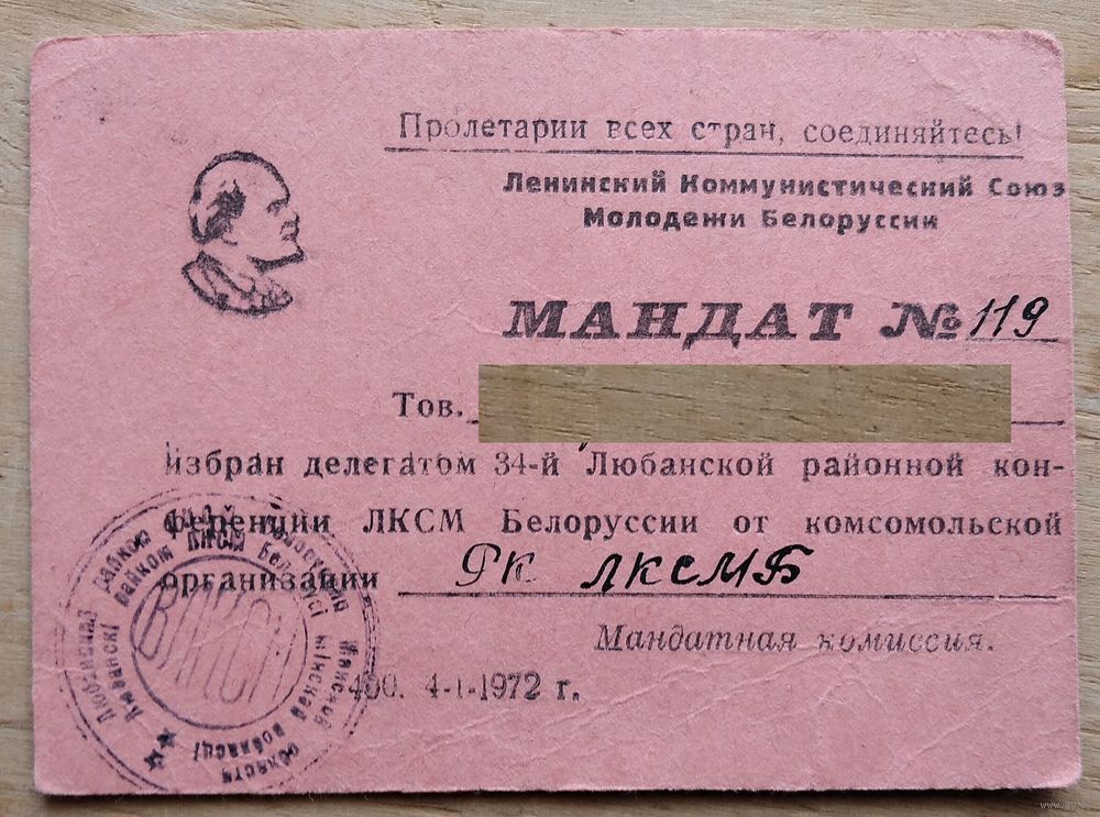 Мандат делегата Районной конференции ЛКСМБ. Любань. 1972 г.