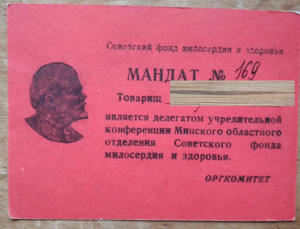 Мандат делегата учредительной конференции Минского обласного отделения Советского фонда. 1970-е г
