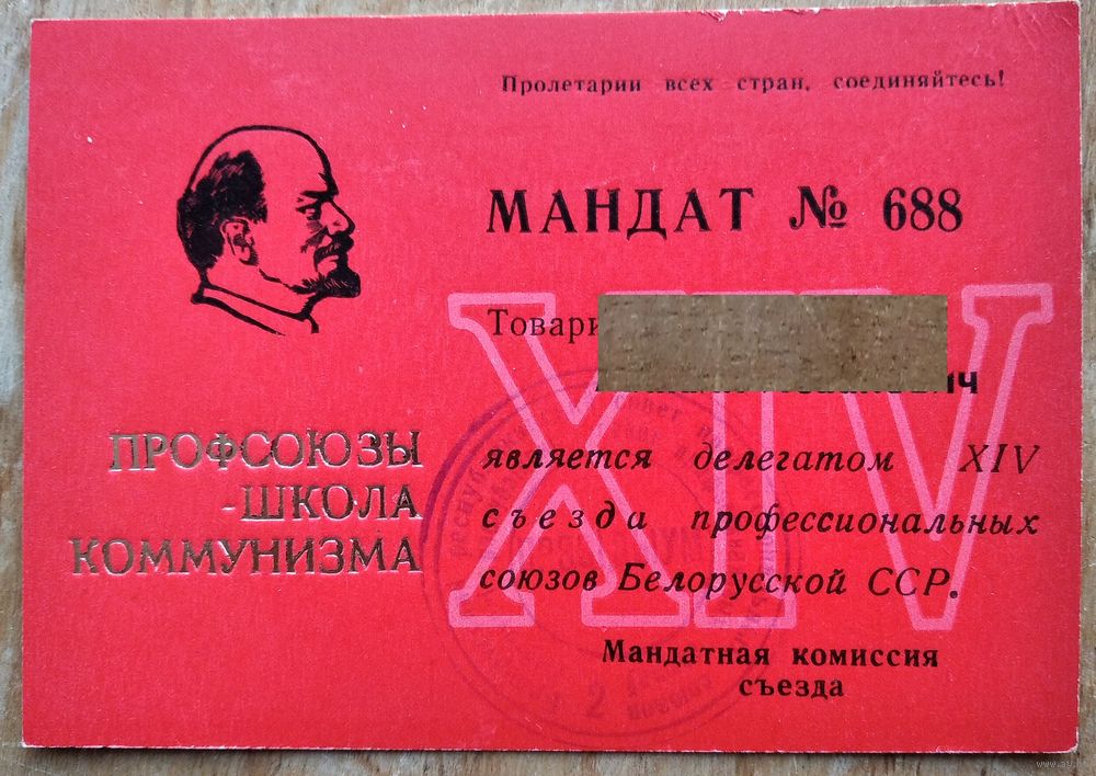 Мандат делегата XIV съезда профессиональных союзов Белорусской ССР. 1977 г.