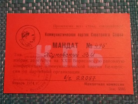 Мандат. Партийная конференция КПБ. г. Борисов 1974 год.