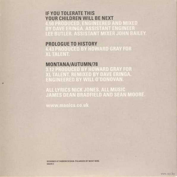 One of two separate UK "If You Tolerate This Your Children Will Be Next" CD singles released at the same time (although CD 1 or 2 is not printed on either release, instead they simply feature similar artwork in different colours; this one being in light grey/beige).