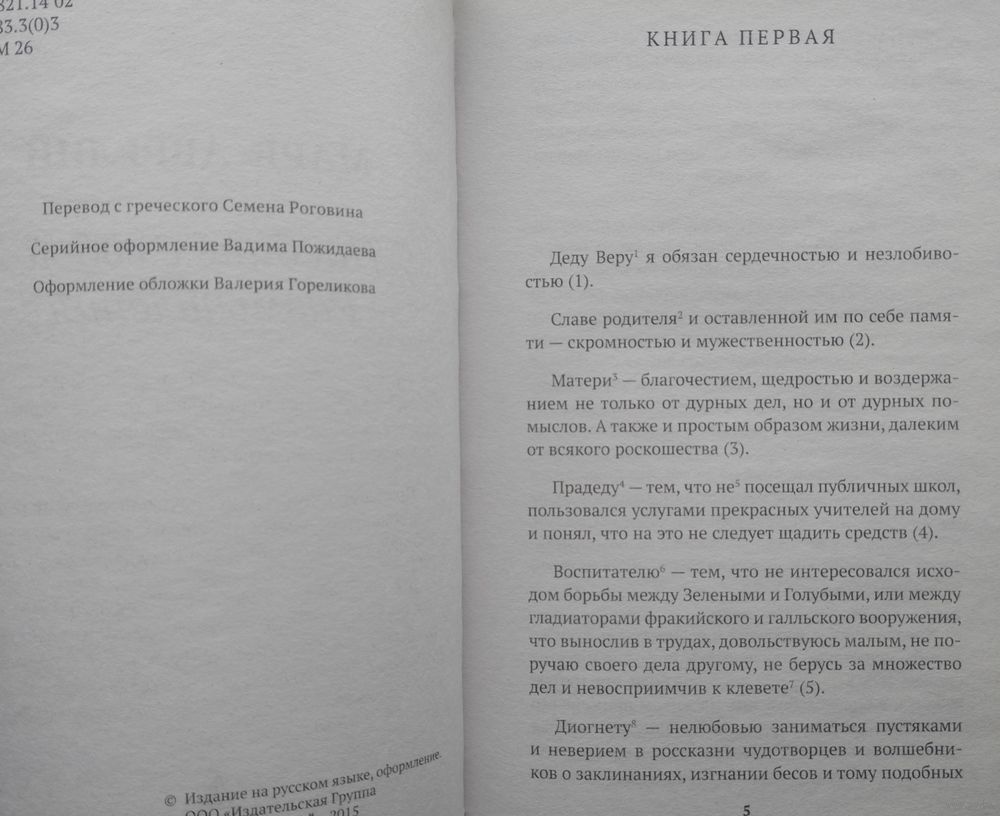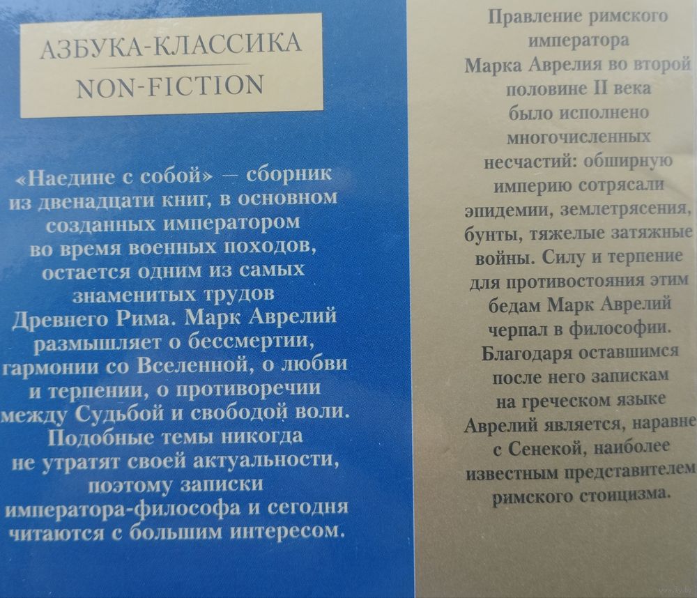 Тираж 4000 экз. 192 стр. "Наедине с собой. Размышления" - сборник афористических мыслей Марка Аврелия, написанный им на греческом языке (койне) в 70-е годы II века во время войны на дунайской границе. Он пользовался несомненным успехом в позднеантичное время, а в XVI веке возродился в европейских философских кругах. Эти личные записи отражают упорное стремление императора не только руководствоваться в своем мироощущении учением стоиков, но и развивать его дальше, назвав ведущим началом в человеке не душу, но разум, который нужно привести в согласие с природой целого, достигнув таким образом бесстрастия.