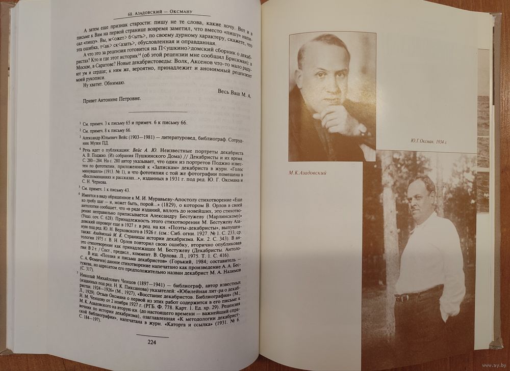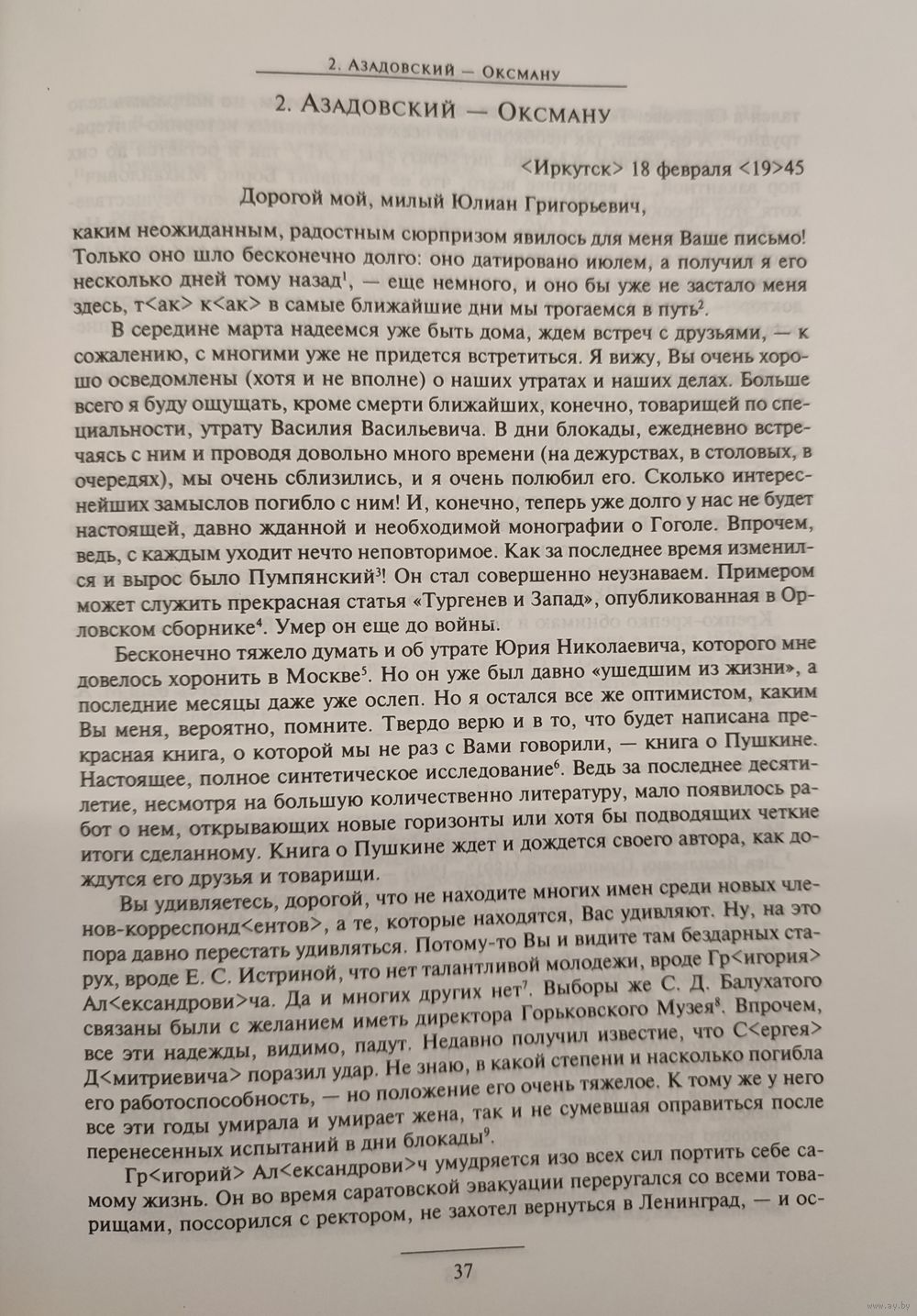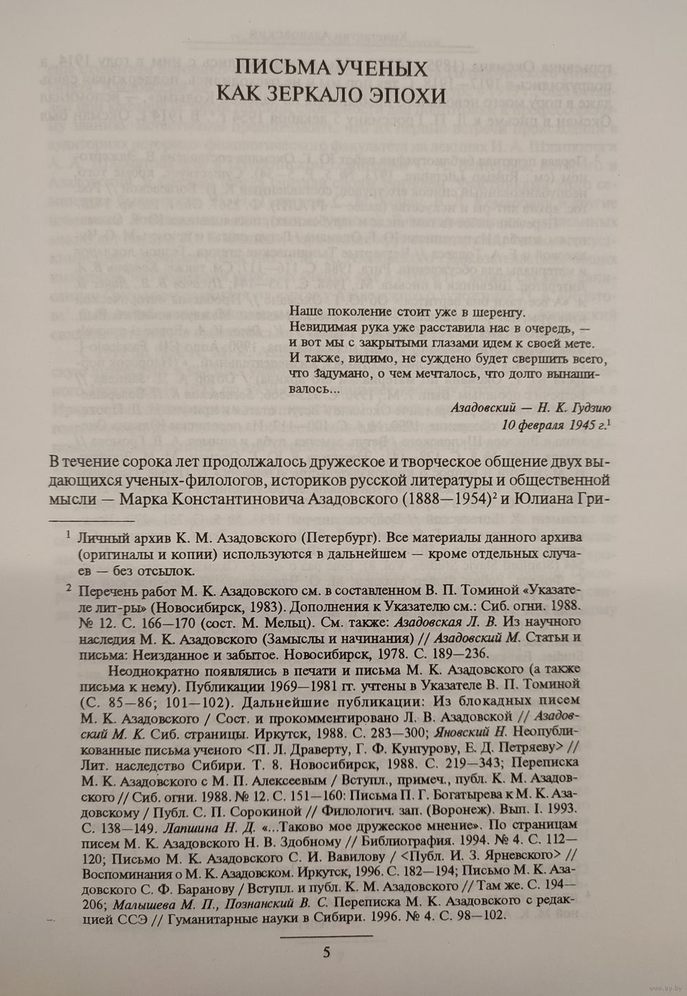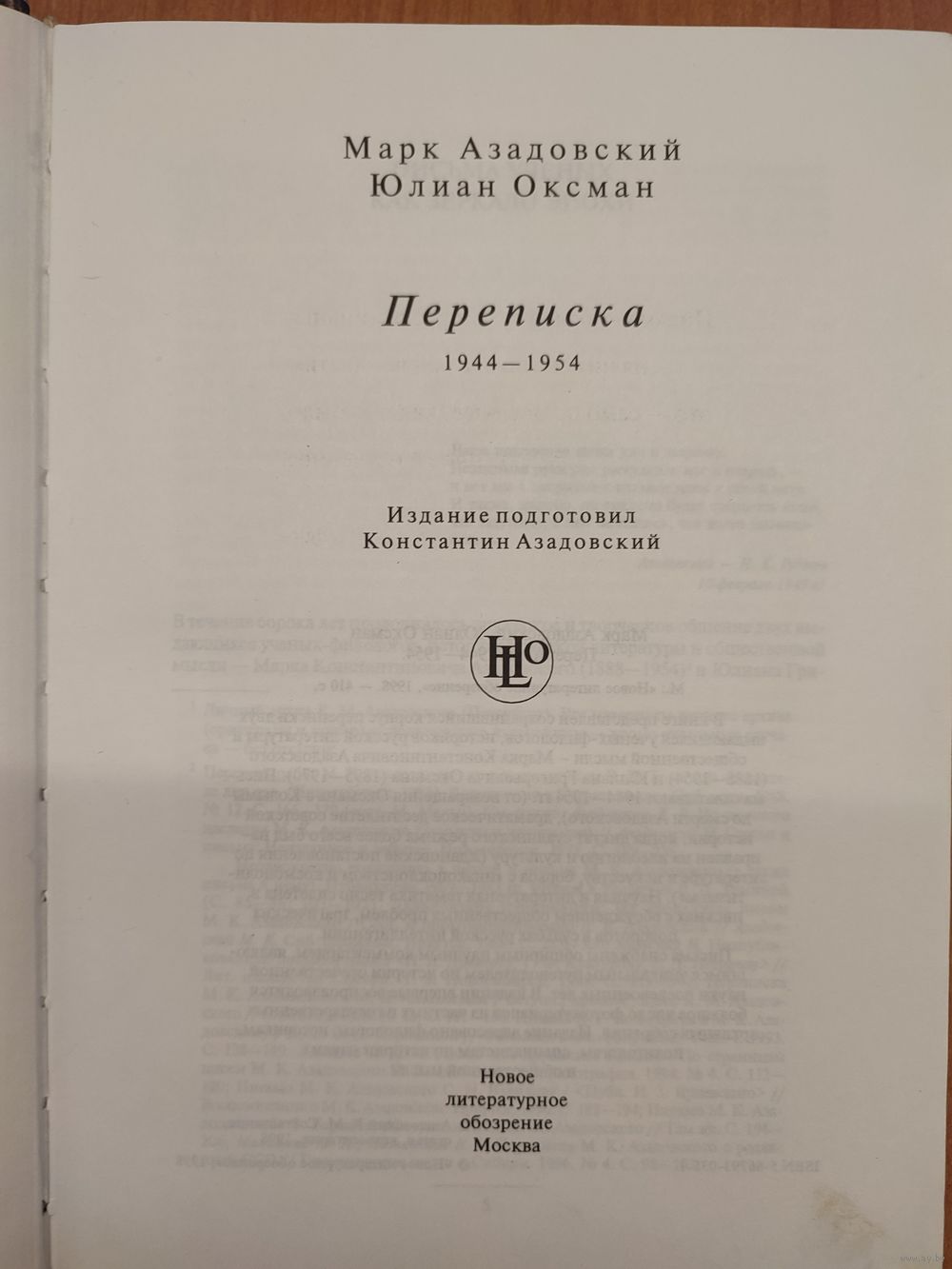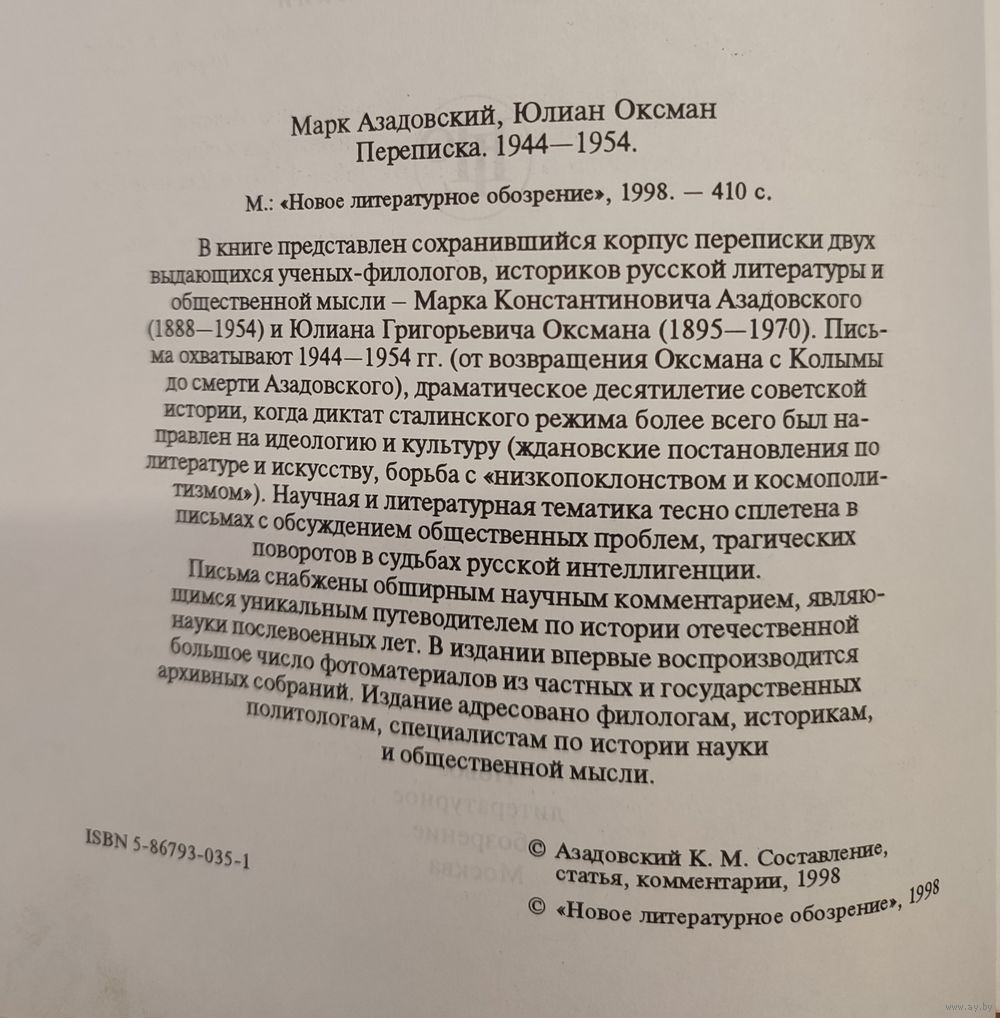 В книге представлен весь сохранившийся корпус переписки двух выдающихся ученых-филологов, историков русской литературы и общественной мысли — Марка Константиновича Азадовского (1888–1954) и Юлиана Григорьевича Оксмана (1895–1970). Письма охватывают 1944–1954 гг. (от возвращения Оксмана с Колымы до смерти Азадовского) — драматическое и мрачное десятилетие советской истории, когда сталинский режим с особой силой обрушился на науку и культуру (ждановские постановления по литературе и искусству, борьба с «низкопоклонством», «космополитизмом» и т. д.).