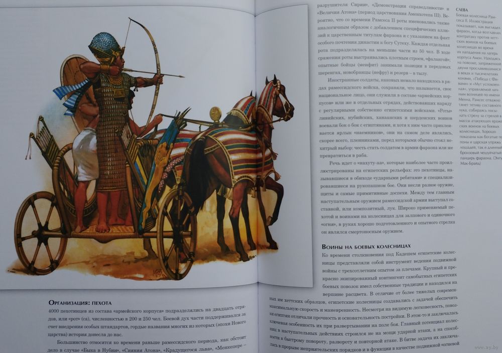 Большой энциклопедический формат. Мелованный альбом. Тираж 2000 экз. Битва при Кадеше — сражение между войсками Египетского и Хеттского царств, сильнейших держав Ближнего Востока, в конце XIV — начале XIII веков до н. э.. Войска возглавляли фараон Рамсес II и царь Муваталли II. Столкновение произошло в городе Кадеше на реке Оронт (территория современной Сирии). Хетты, имевшие явное преимущество, не смогли распорядиться им должным образом, что в итоге привело к тактической ничьей и многочисленным потерям с обеих сторон. Хетты одержали стратегическую победу, так как египтяне не сумели занять Кадеш и разбить хеттскую армию, что привело к провалу вторжения. В итоге был заключен мирный договор между хеттами и египтянами. Обе стороны приписали победу себе. Это сражение стало первым в истории, отображённым в источниках обеих воюющих сторон, что повысило к нему интерес со стороны исследователей военной науки, историков, египтологов и военных всего мира. Кроме того, битва при Кадеше стала последним крупным сражением эпохи бронзового века: хетты уже использовали железное оружие. Битва при Кадеше произошла на пятый год правления Рамсеса II, что датируется разными источниками концом XIV — началом XIII веков до н. э.