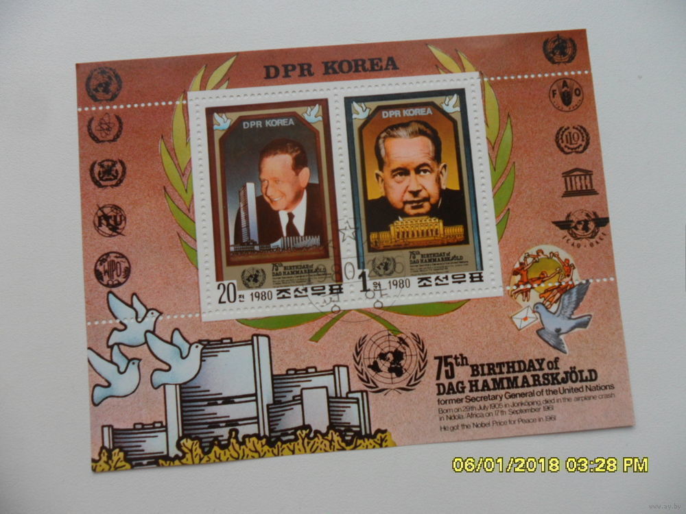 Марка KOREA - SGN2035-MSN2036 NH/CTO 1980 SHEETLET 75th BIRTHDAY DAG HAMMARSKJOLD
