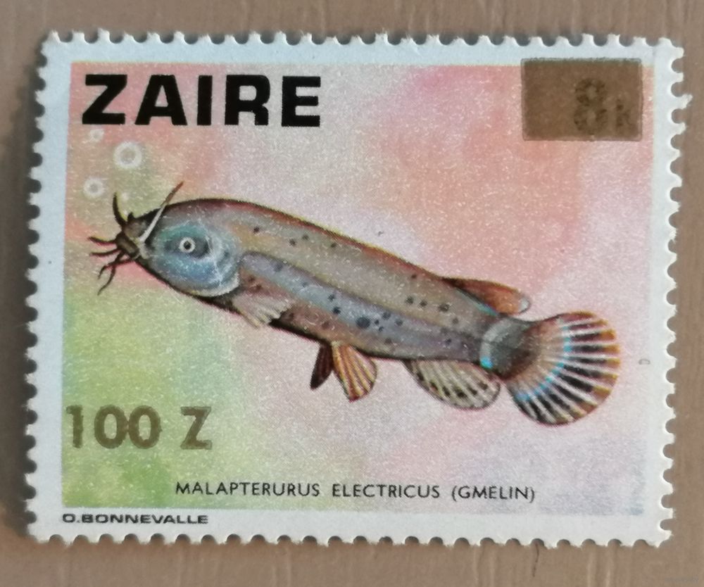 Марка Заир, Конго, фауна, рыбы, электрический сом, 1982 г.