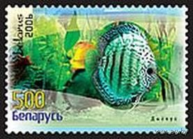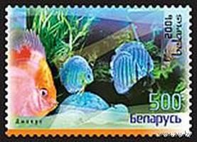 Марки "Аквариумные рыбы. Дискус красный", "Дискус фиолетовый", "Дискус зеленый", "Дискус желтый"