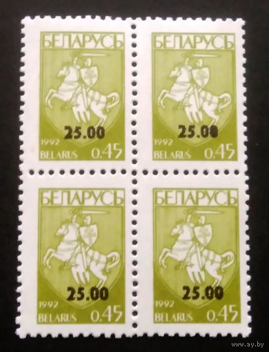 Марки. Беларусь. 0131.квартблок стандарт.надпечатка 25,00 руб.(0,45 коп.) #2 1994 г.